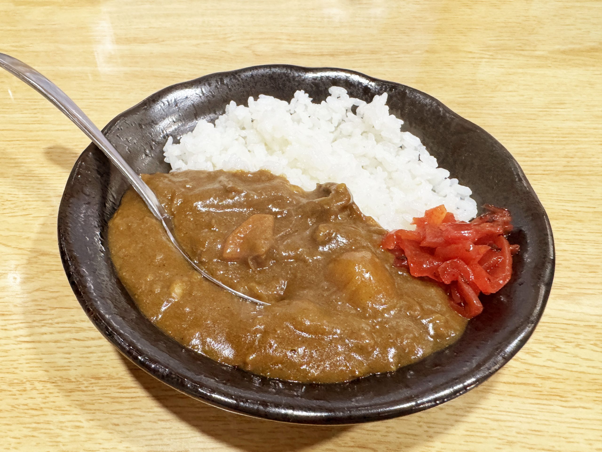 カレーをよく見てほしい。極めて粘性が強く、かなり濃密濃厚な密度のカレーに仕上がっている。極めてネットリとしたカレーをライスとともにスプーンですくう。密度が高いからなのか、けっこうズッシリとした重量を感じる。うまい、うますぎる。