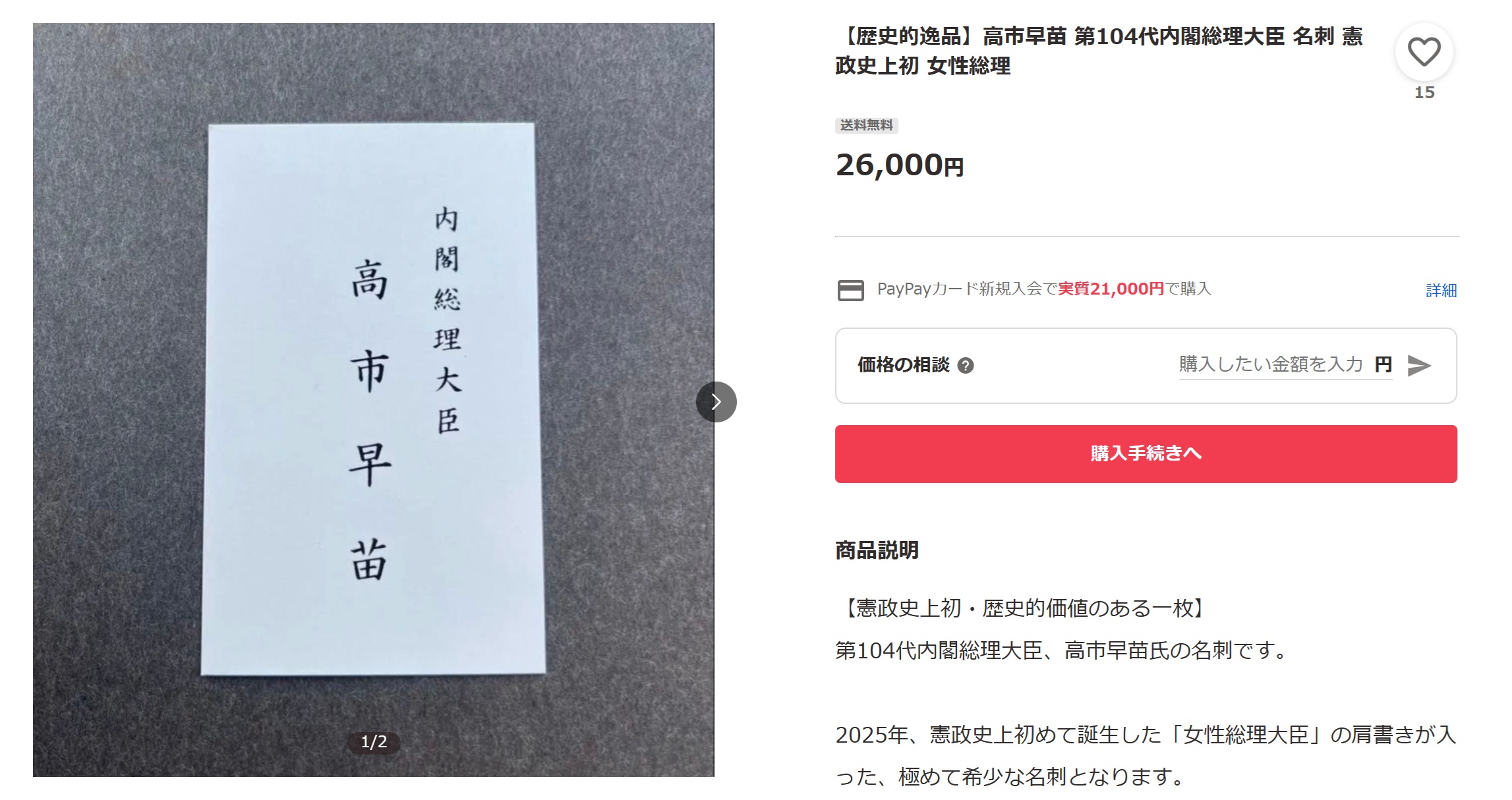 某フリマサイトに高市総理の名刺が売られていました。その値段、1枚26,000円(送料無料)。これって良いんですかね??