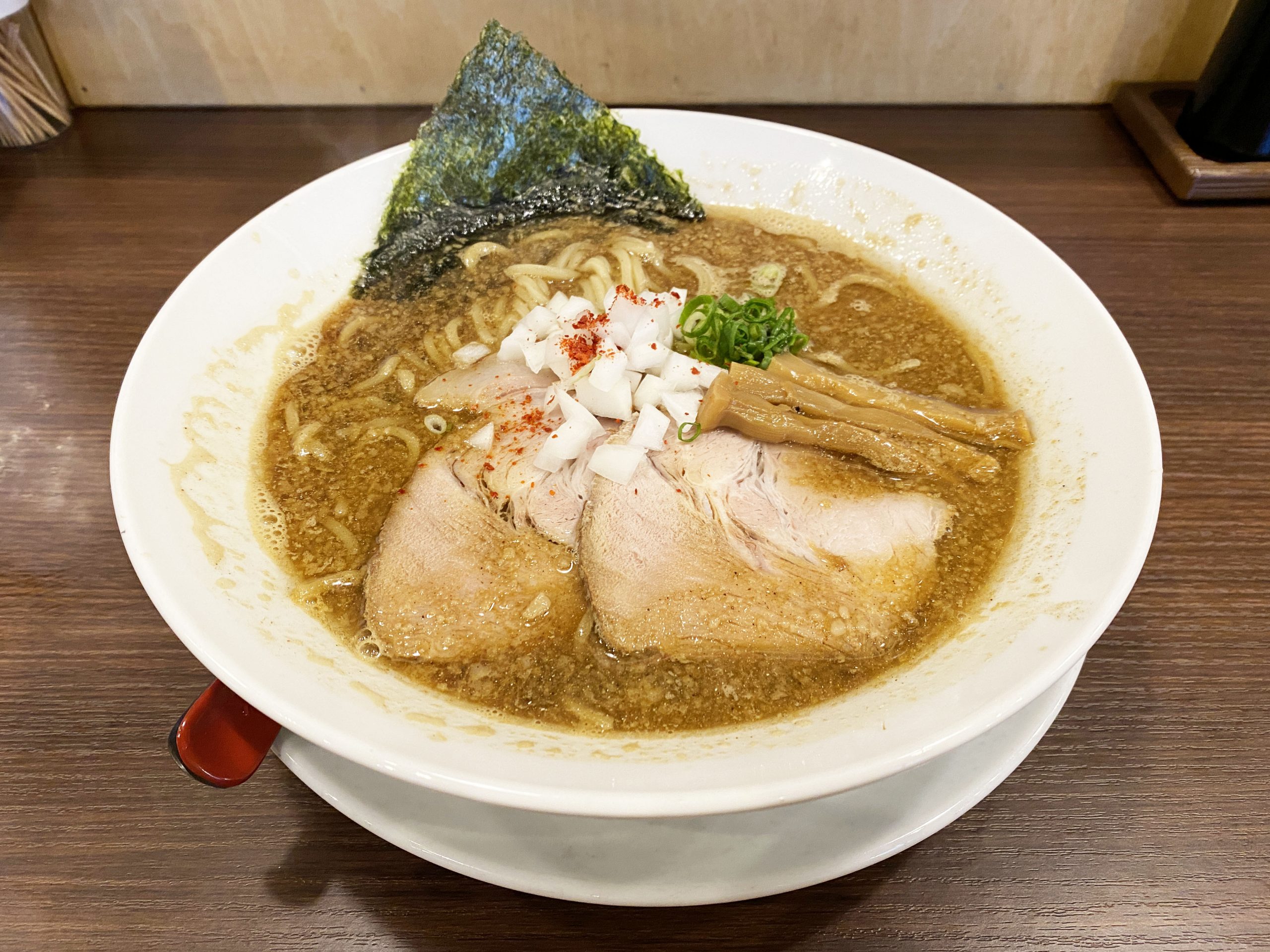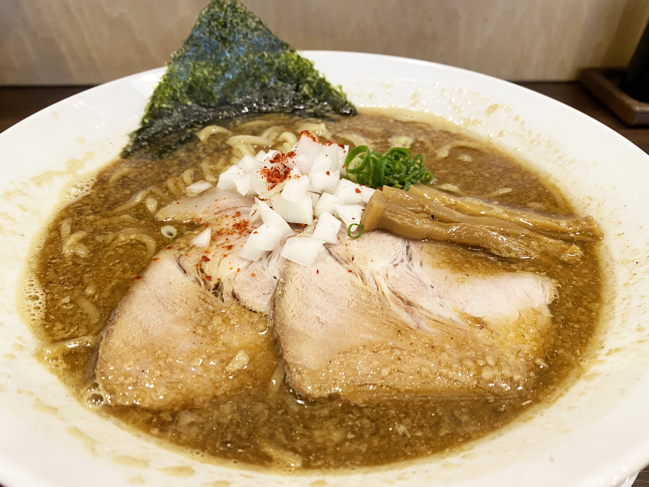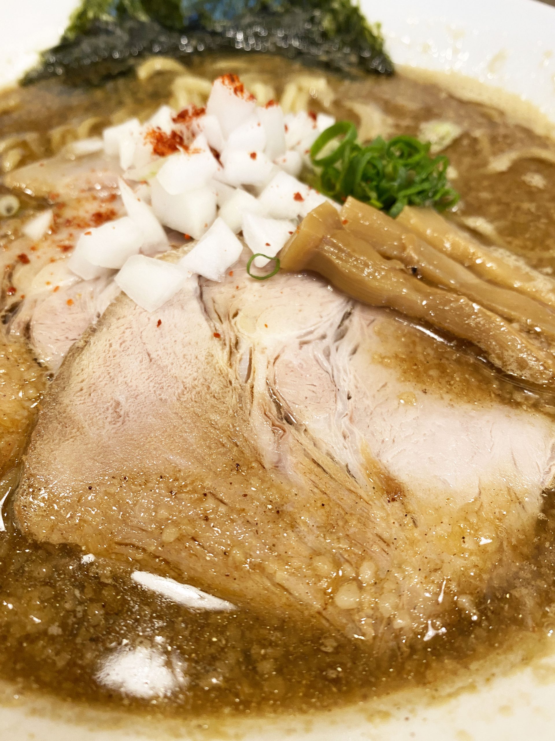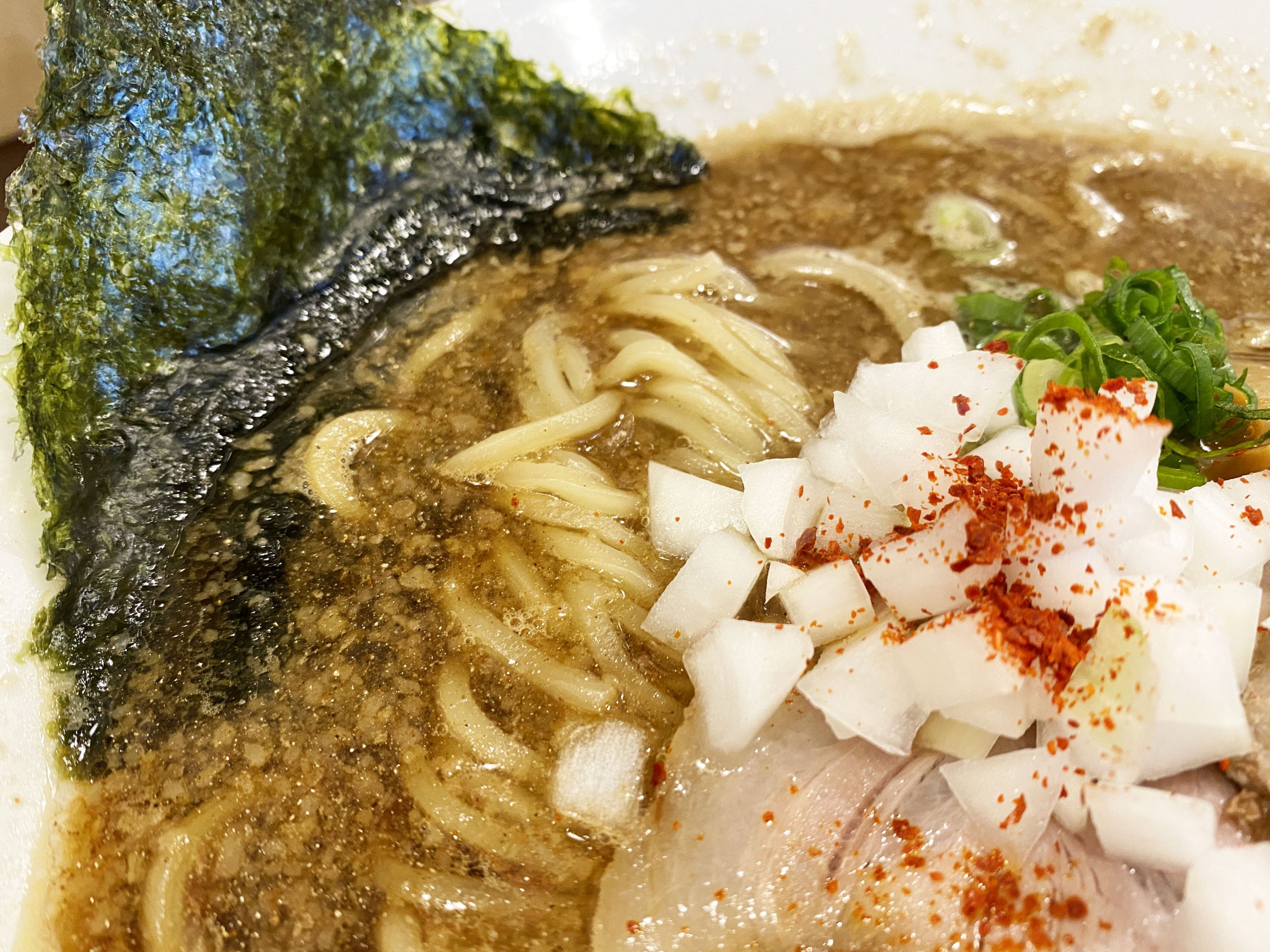 背脂とタマネギの融合が素晴らしく、ガツンとアブラパワー強めなのに、玉葱のシャリシャリ感と爽やかエキスで緩和。その流れが素晴らしい。「麺屋 愛心 河渡本店」(新潟県新潟市東区河渡本町22-16-5)。