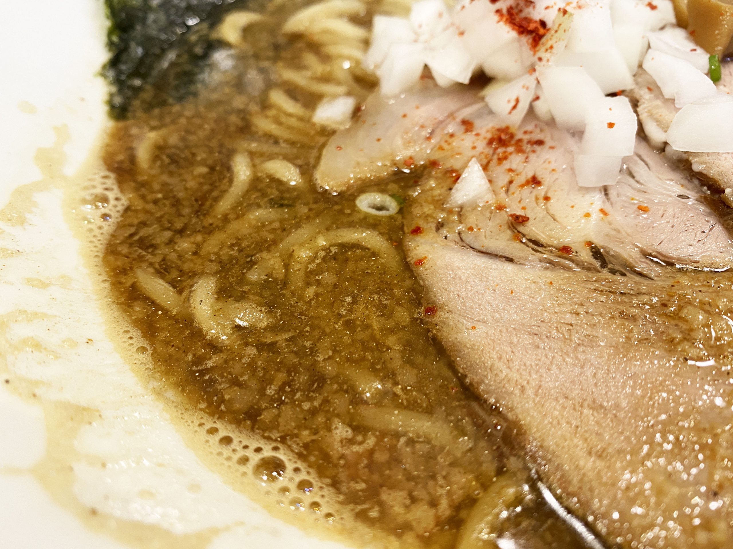 油膜と徹底的に濃いスープを楽しむラーメンここにあり。目視ではドロッドロに見えるが、ほどよいドロドロなので食べやすく、塩味より旨味を強く感じる仕上がり。とはいえ、世間一般のラーメンより全体的にパワフル。