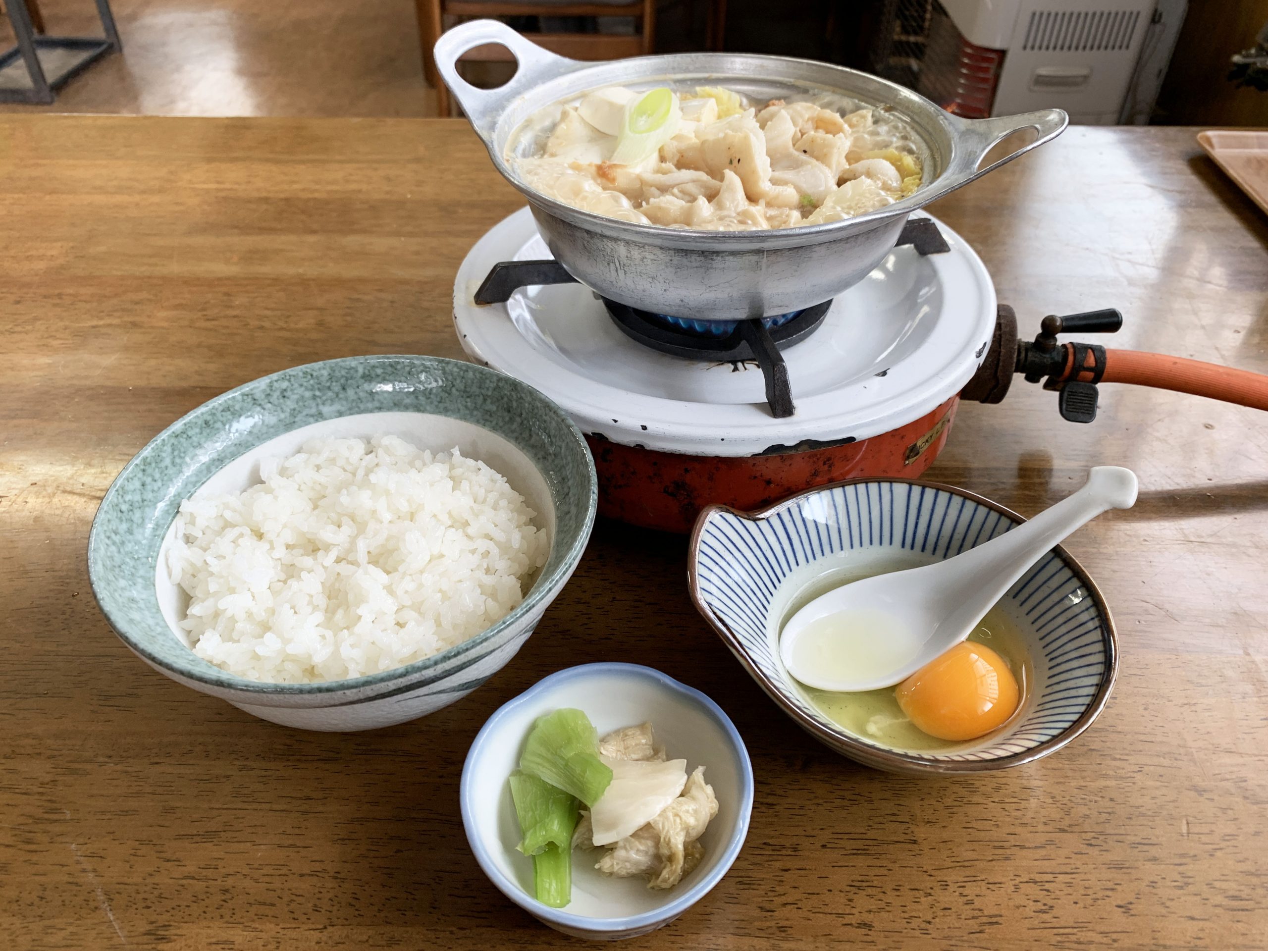 野菜と肉たっぷりのホルモン鍋、ライス、漬物、生卵が食べられる贅沢な逸品。ホルモン鍋は生野菜と冷凍ホルモンがガッツリと鍋に投入された状態でテーブルに出される。