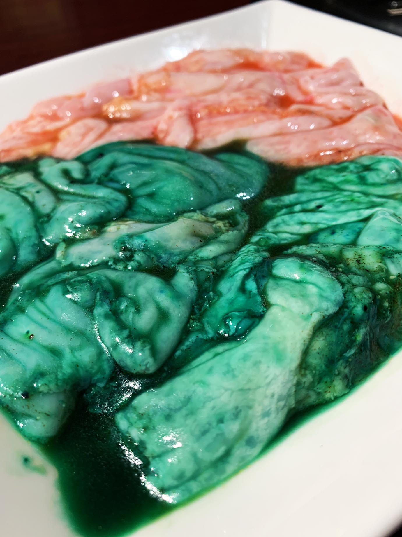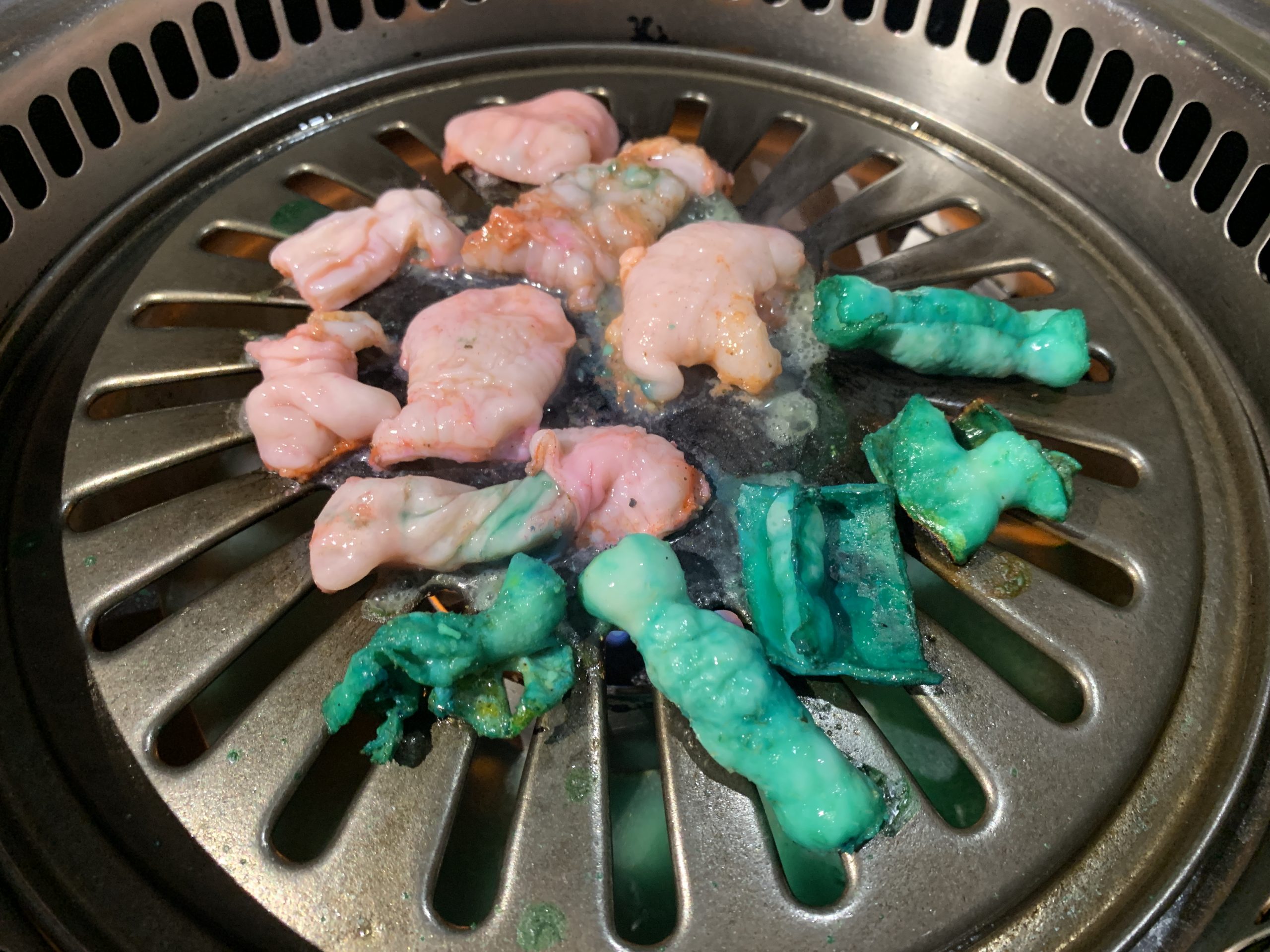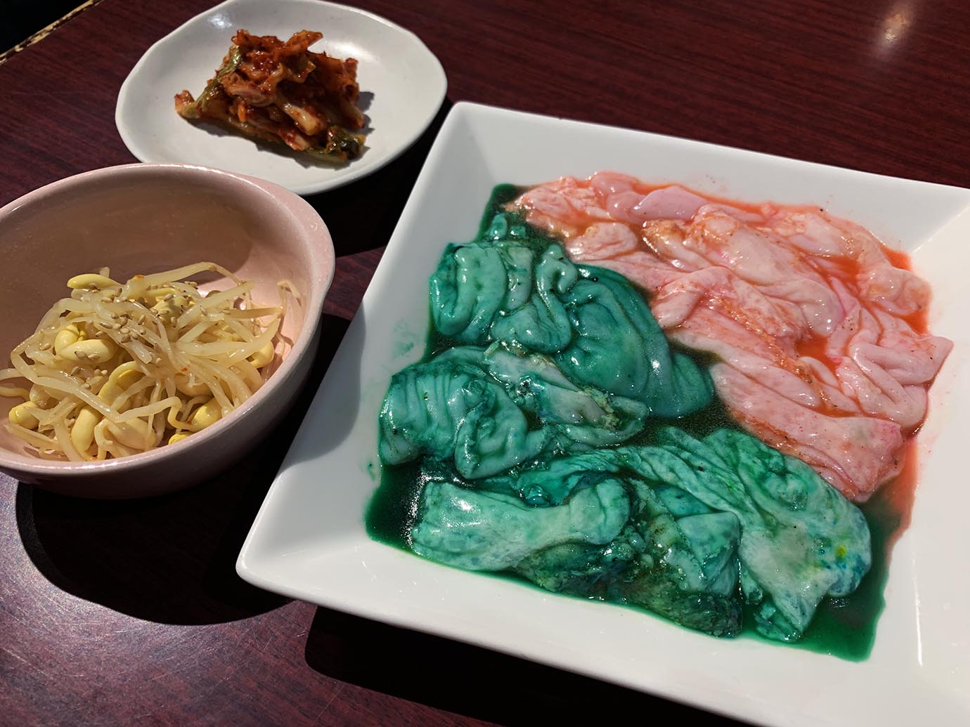 厳密にはグリーンというよりエメラルドグリーンかもしれない。コバルトブルーのような色にも思える。普通ではありえない色をしているホルモンだが、これがまた絶品。色で判断してはいけない。