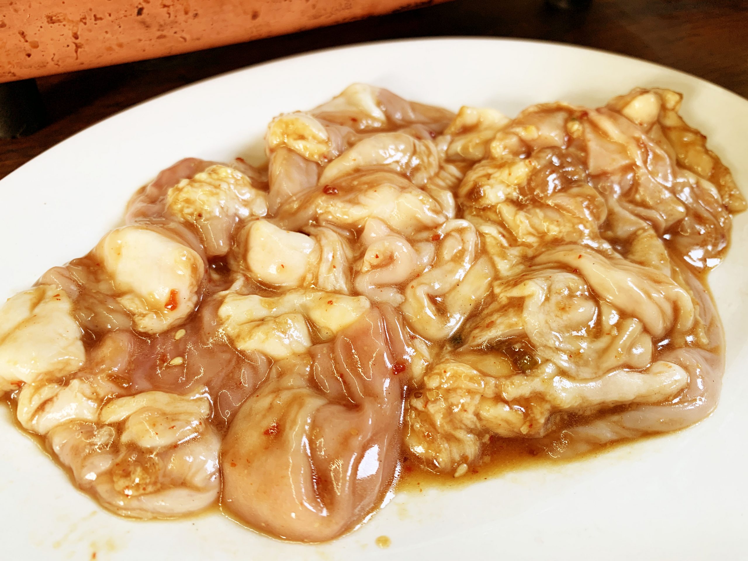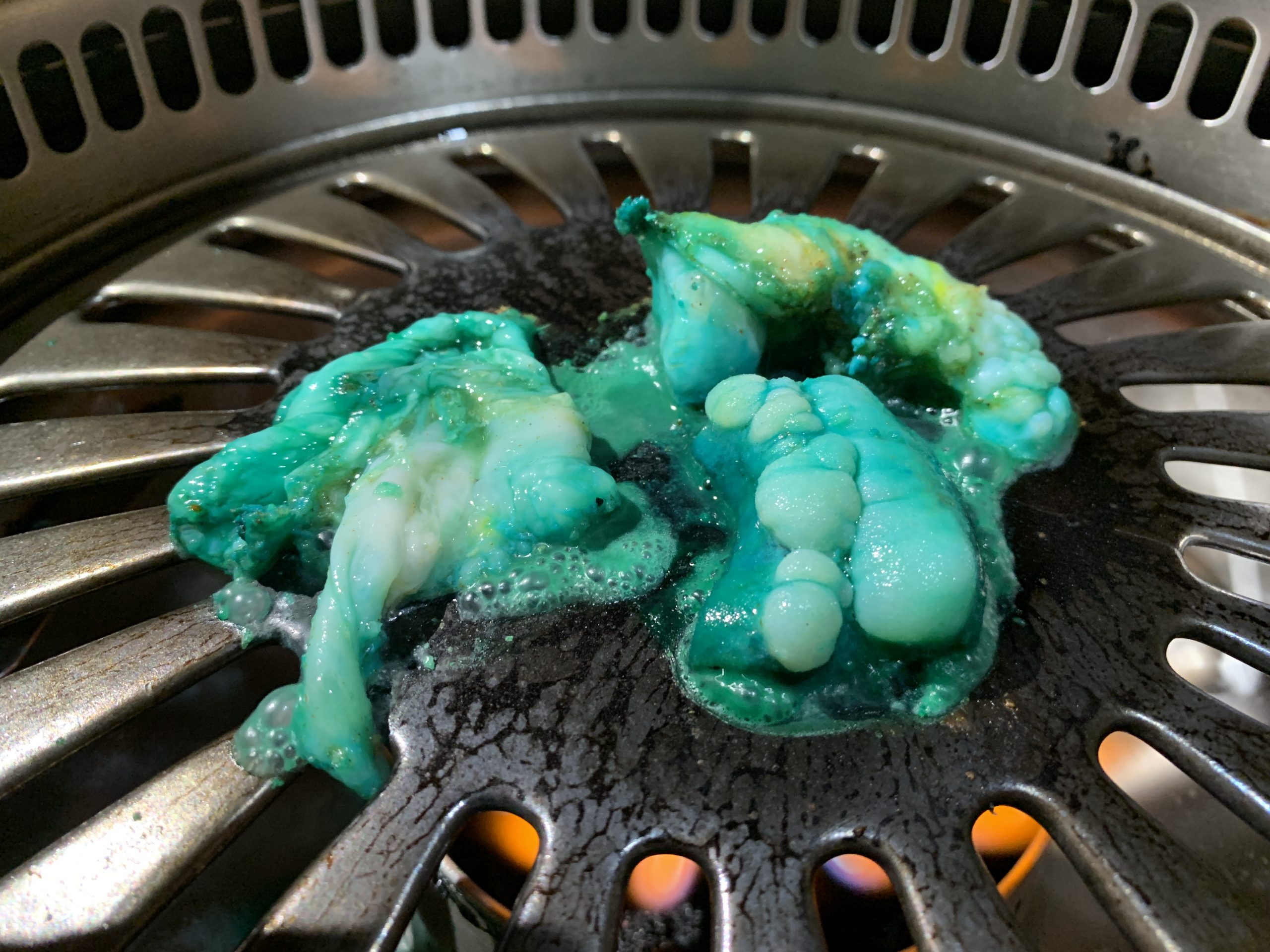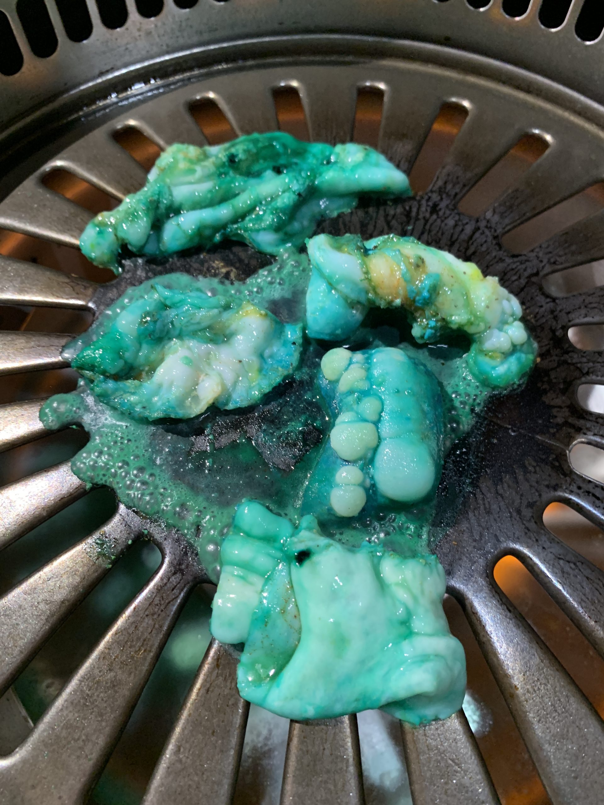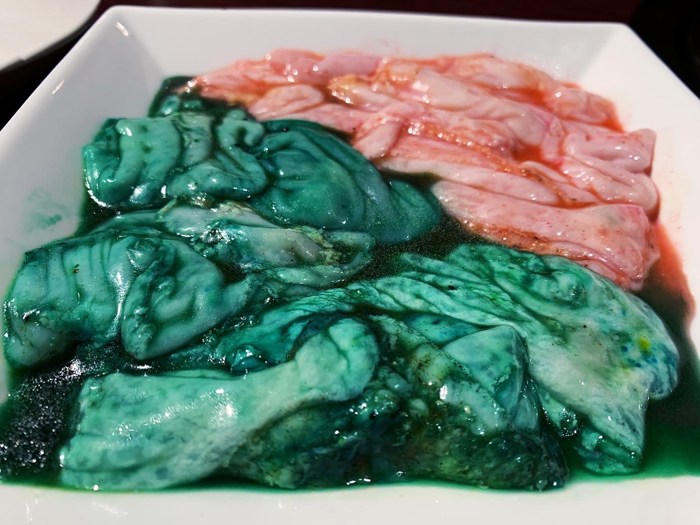 厳密にはグリーンというよりエメラルドグリーンかもしれない。コバルトブルーのような色にも思える。普通ではありえない色をしているホルモンだが、これがまた絶品。色で判断してはいけない。