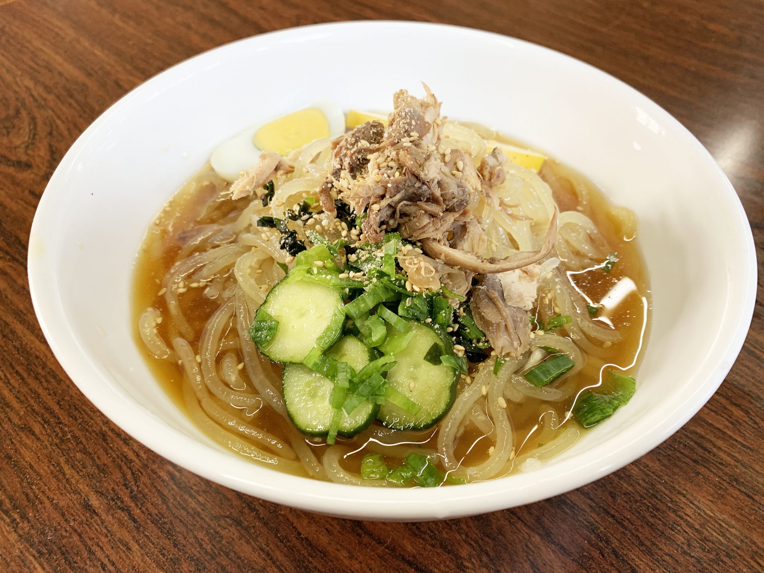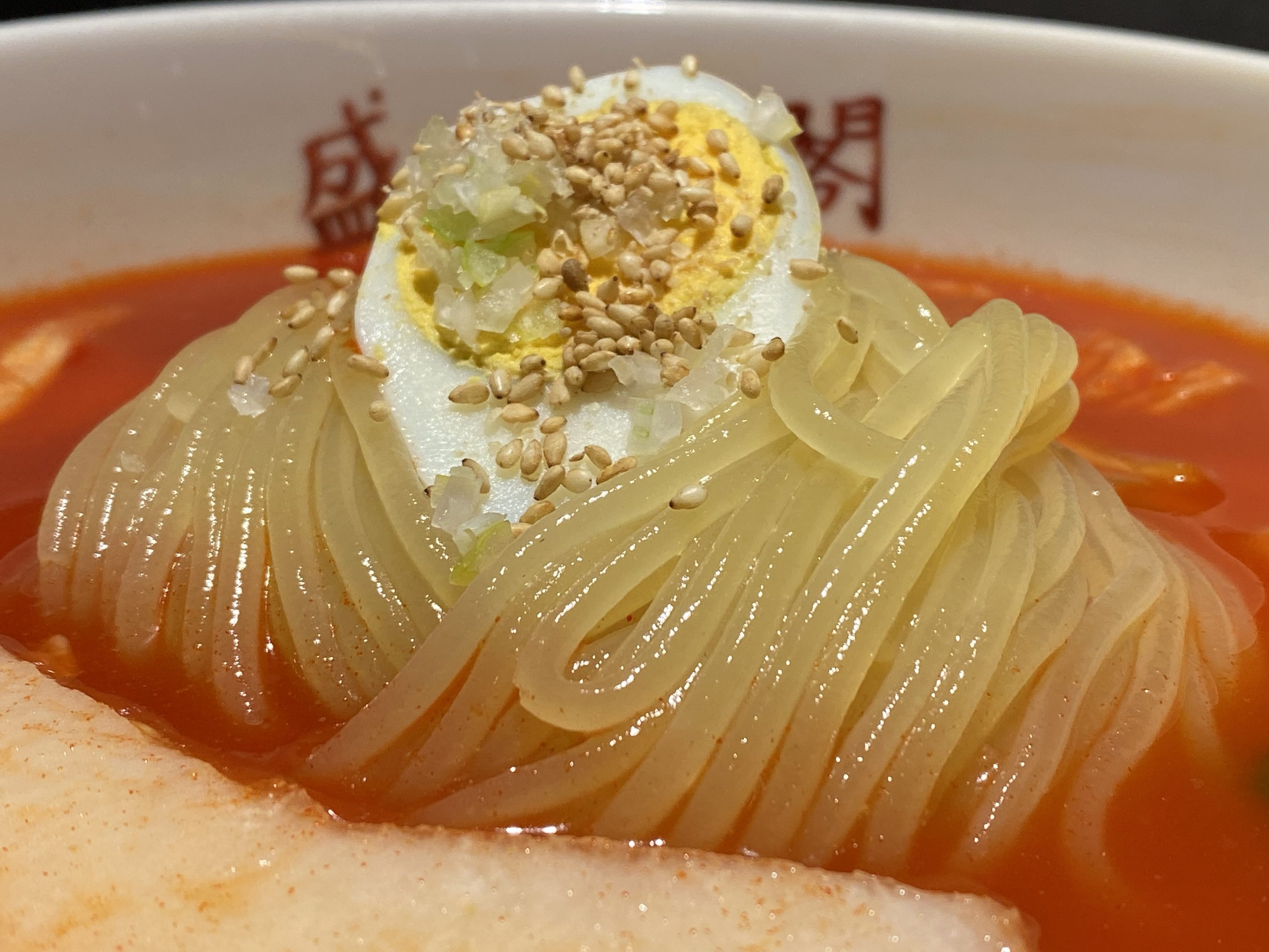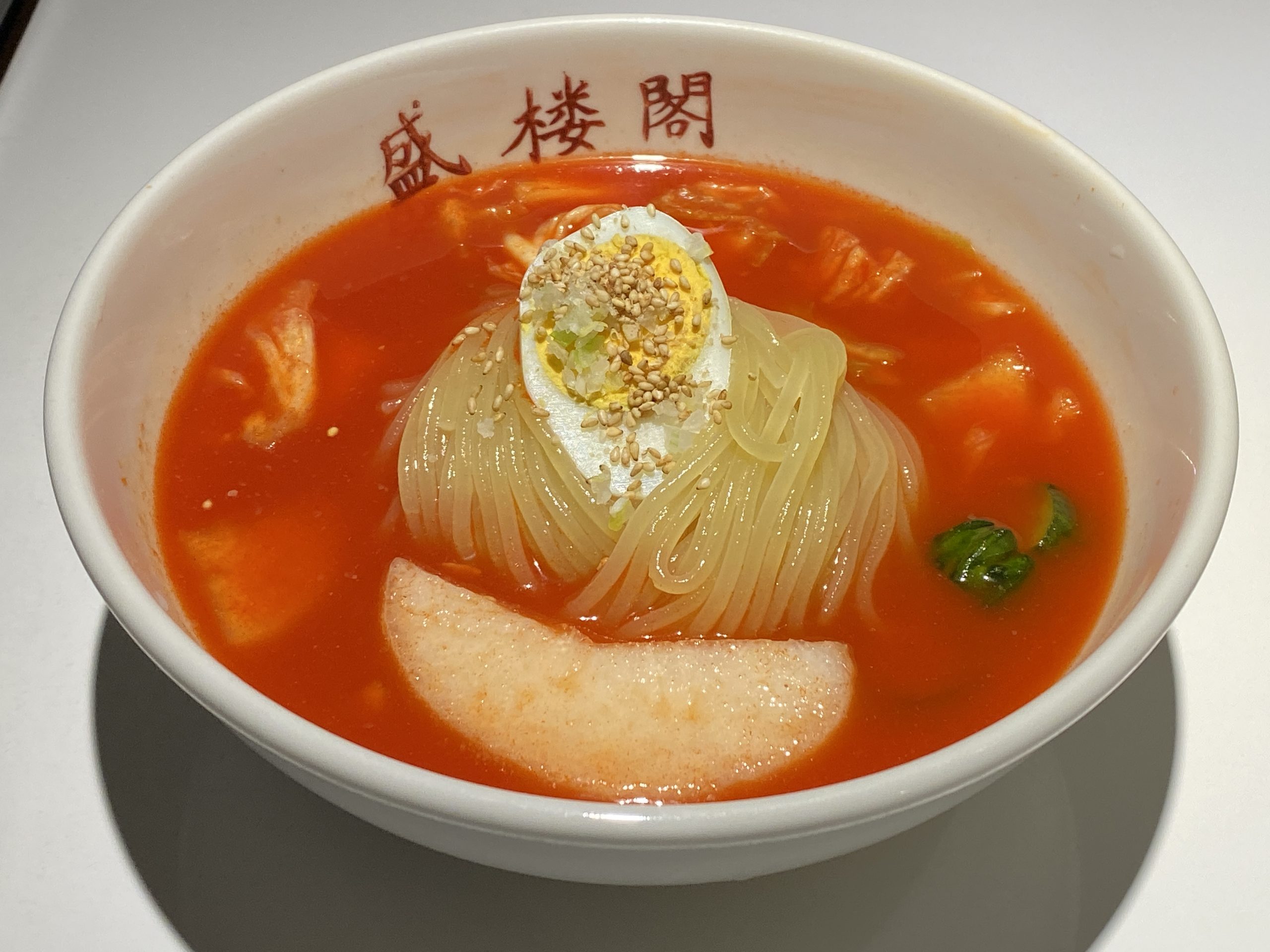 冷麺のスープはクリアでスッキリとしていながら旨味が濃く、塩味ではなく出汁のパワーでズルズルと麺をすすらせる秀逸なるもの。麺のゴキュゴキュとしたコシも至高で間違いないもの。「盛楼閣」(岩手県盛岡市盛岡駅前通15-5)。
