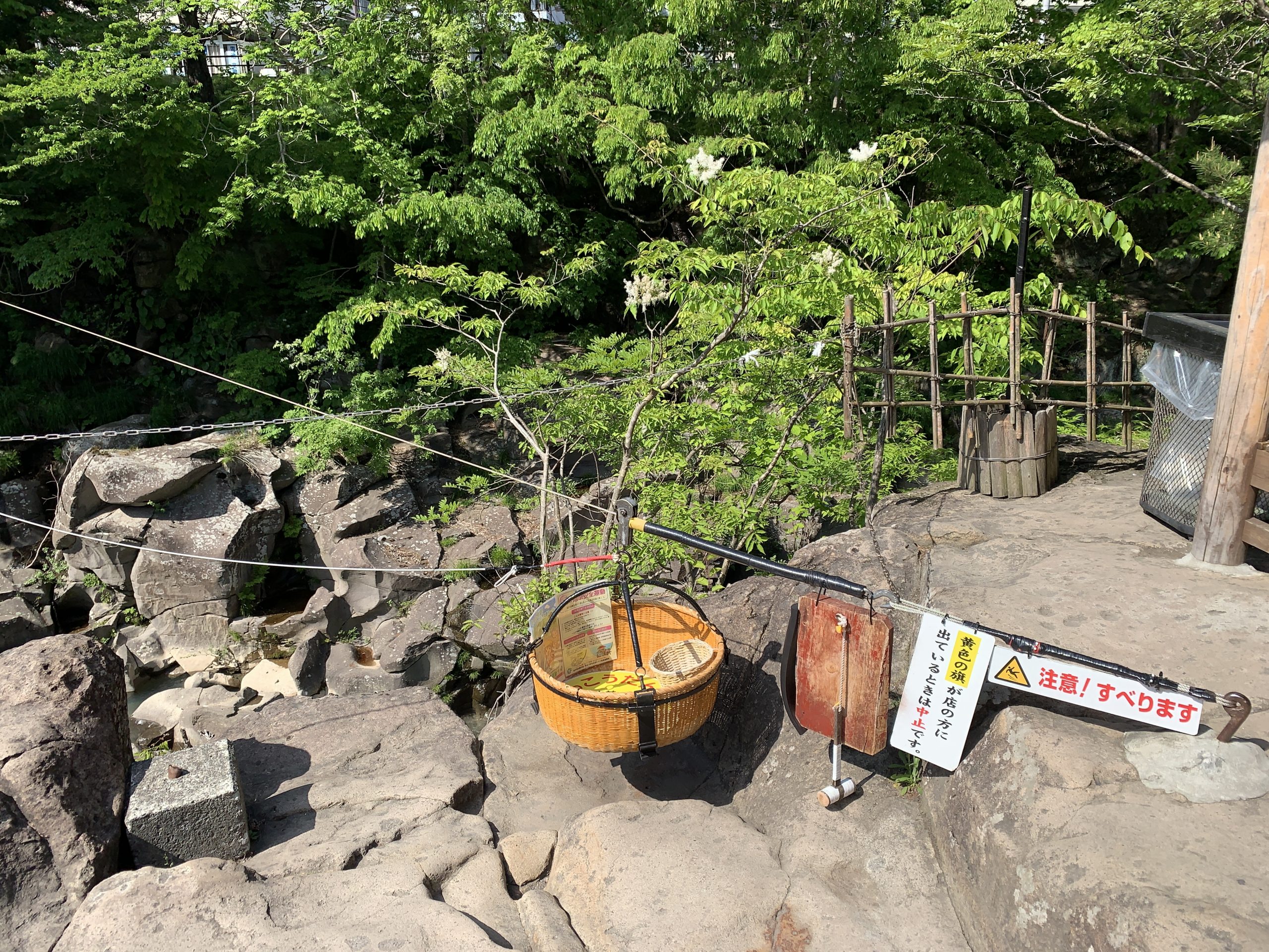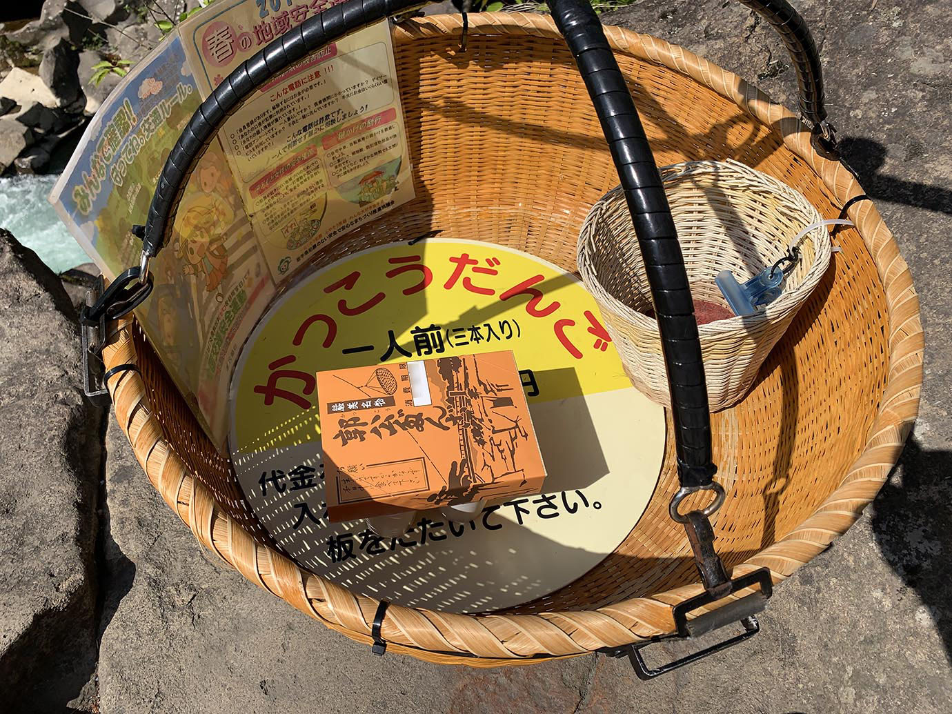 厳美渓は岩手県一関市にある渓谷で、美しい川が流れる絶景地。ここには、ロープに繋がれたザルが置いてあり、そこにお金を入れるとロープがザルを引っ張ってだんごを入れ、また戻してくれるというユニークなグルメが堪能できる。「郭郭公屋」(岩手県一関市厳美町字滝ノ上211)。