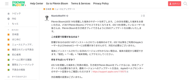 こちらが適用されるのは、『ピクミン ブルーム』v136からということだ。