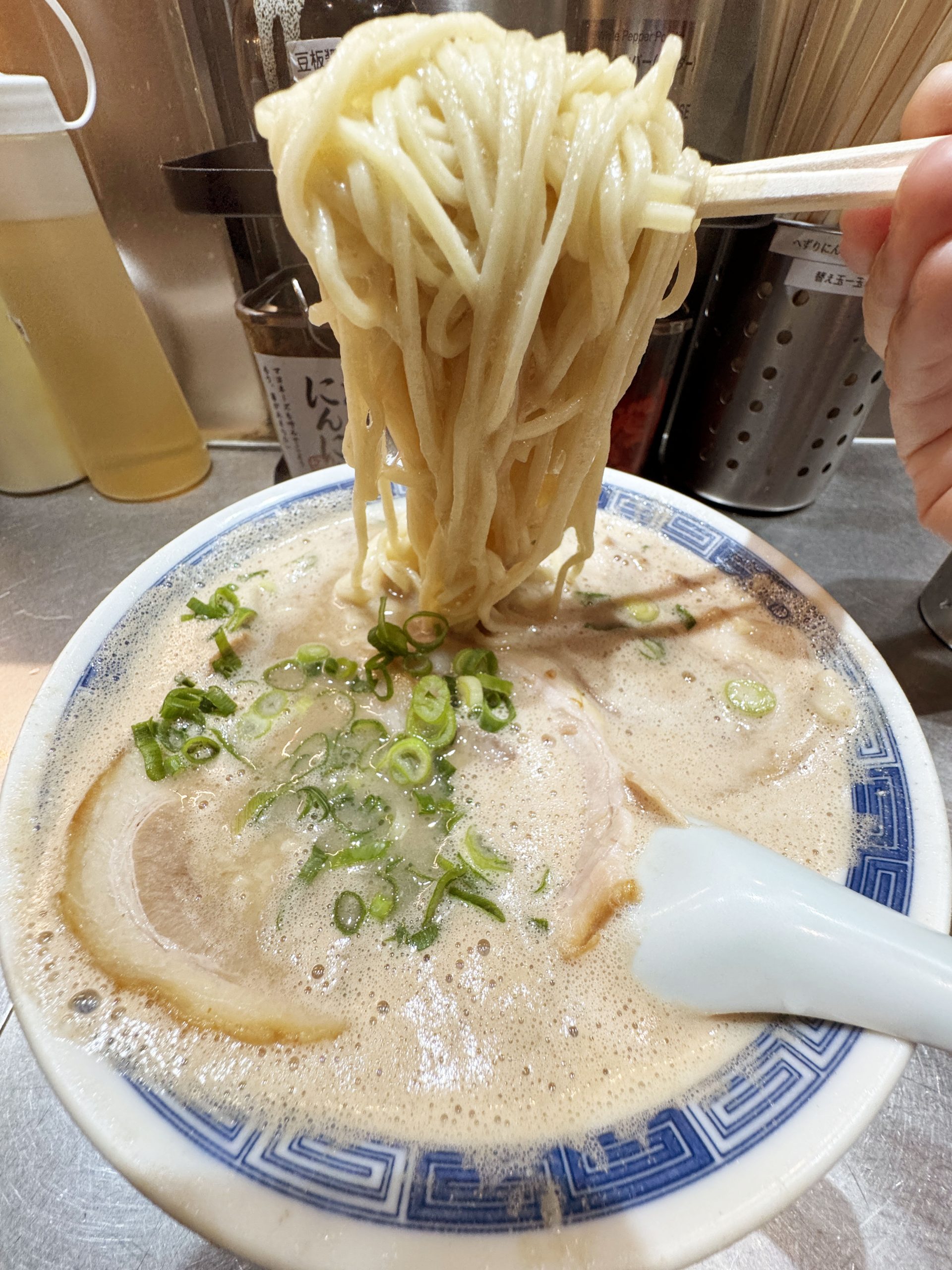 細麺がたっぷりと熟成豚骨スープをとらえて味覚に運ぶため、徹底的に旨味と苦味が濃いテイストを堪能できる。