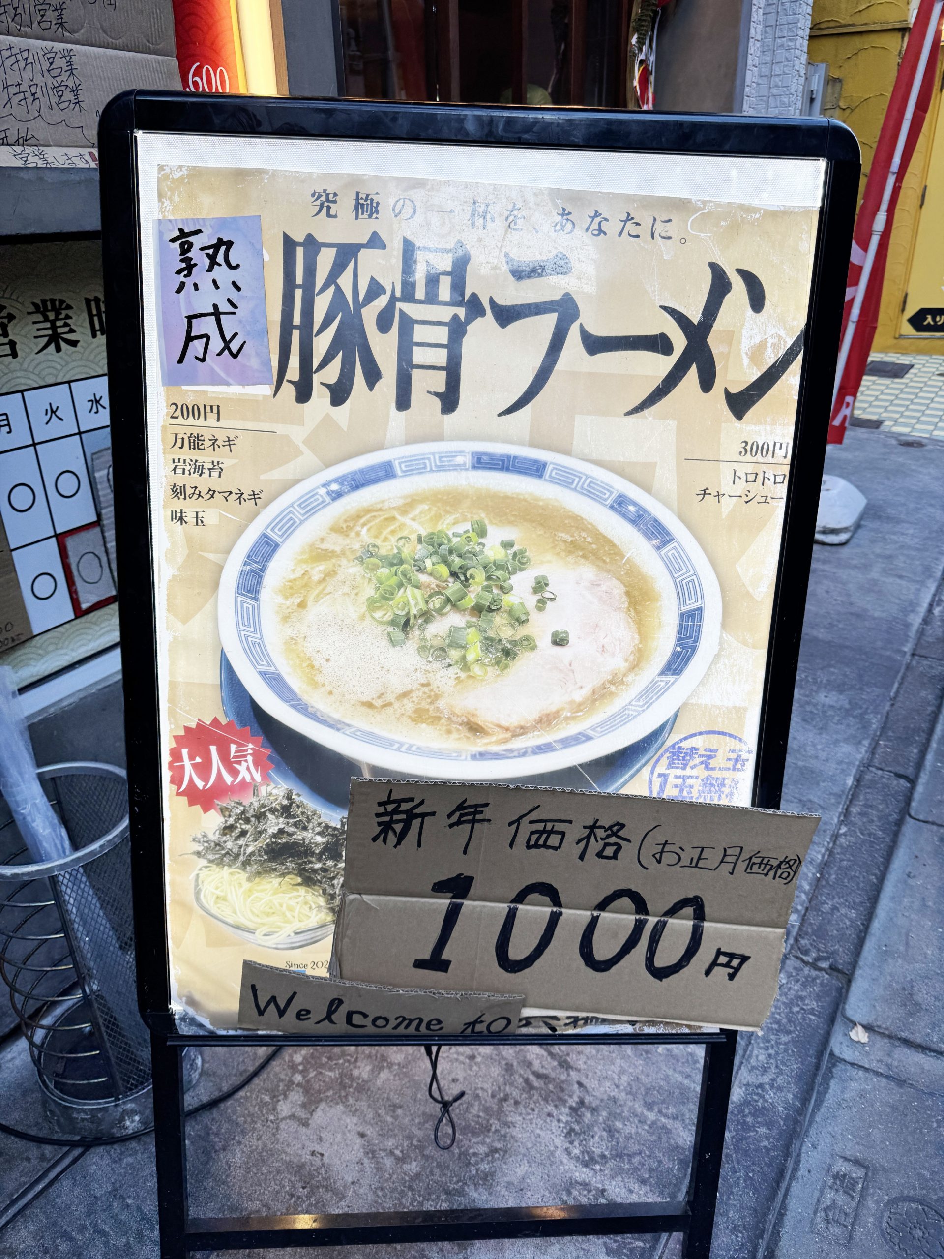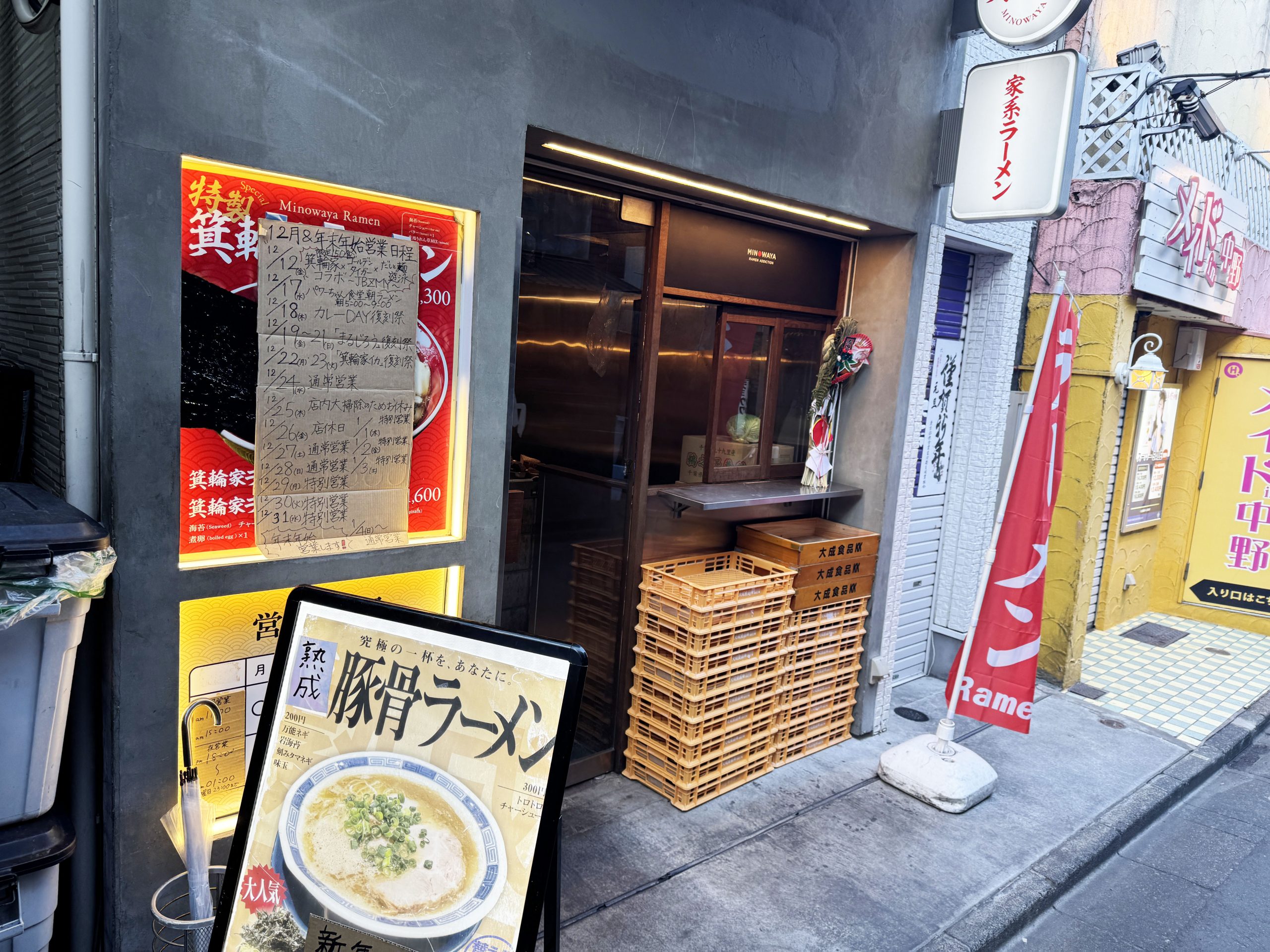2026年1月1日の元旦、箕輪家に出向いた。この日は正月の特別営業だったので、いつも800円の熟成豚骨ラーメンが1000円だった。もともと箕輪家のレベルの高さは知っていたので、200円ぐらいの差は気にならない。200円の差より、期待感のほうが上回る。店内に入り、券売機で熟成豚骨ラーメンの食券を買って着席した。