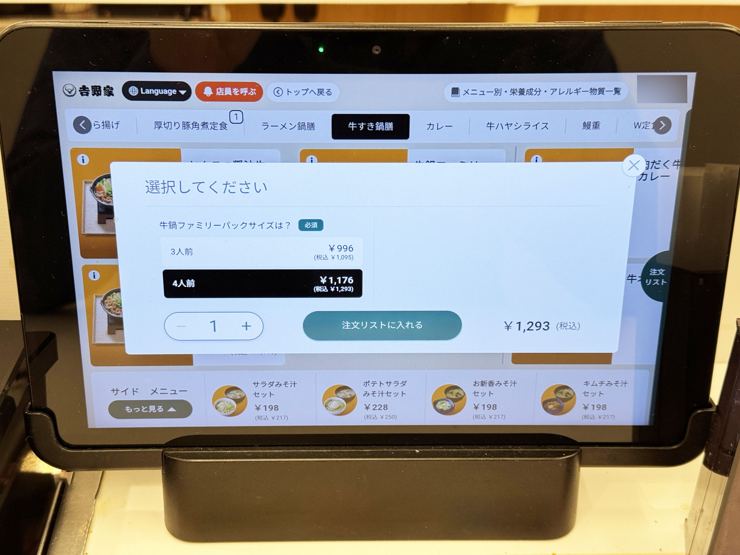 でも、どうしてあまり知られていないのか? おそらくですが、それは、メニューの目立たない場所に表示されているから。たとえばタッチパネル式オーダーの店では、かなりわかりにくいところに牛鍋ファミリーパックが表示されています。それゆえ、客の目に届きにくいという点が、あまり知られていない理由の一つと推測できます。