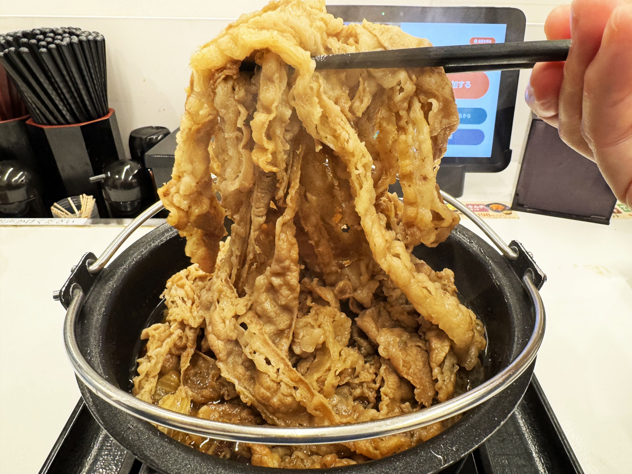 「特製すきやきのたれで煮込んだ大判のすきやき肉は、吉野家ならではの味わい。おかずにぴったりの1品」