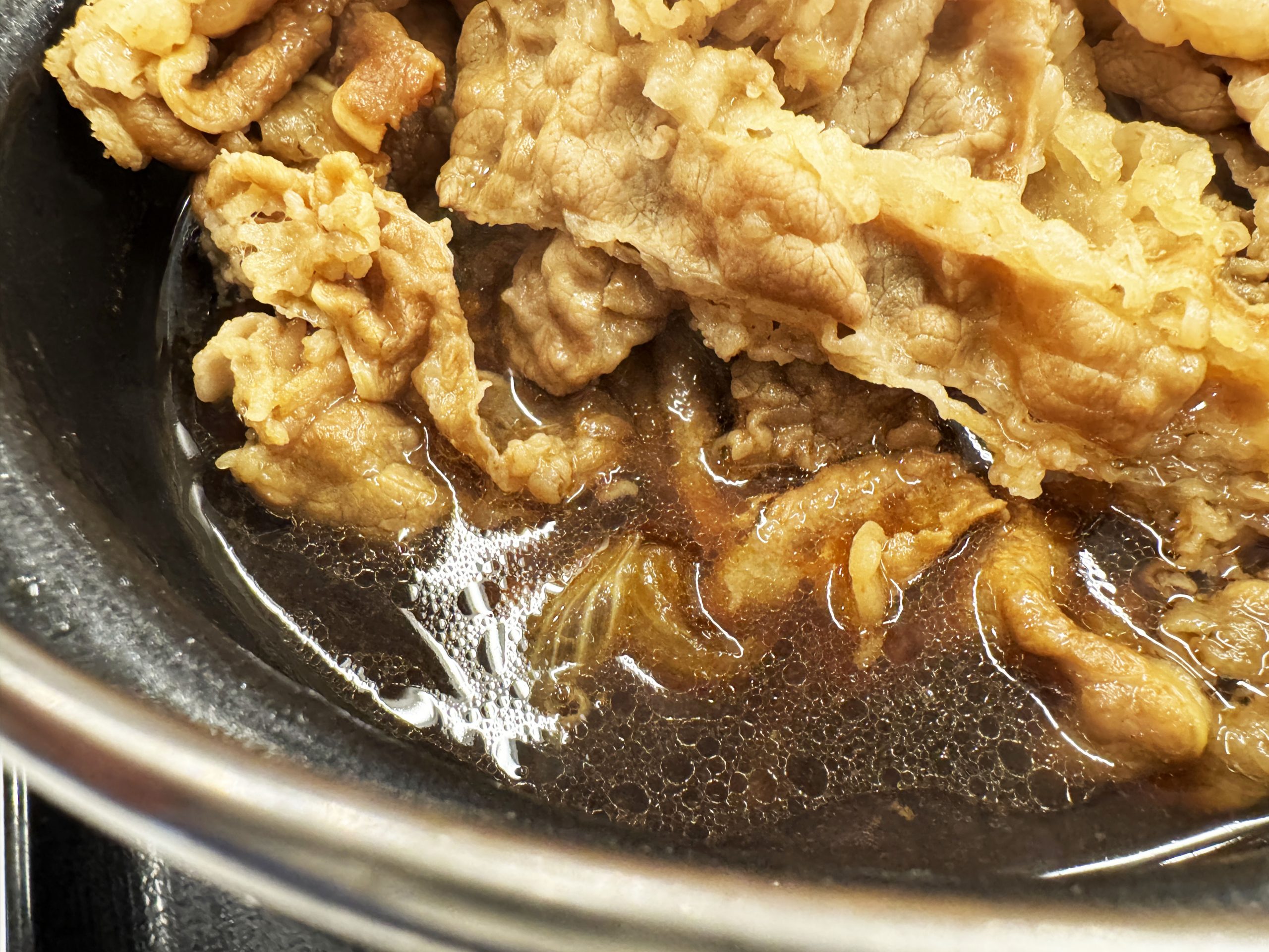 箸でつまんでみれば、ガッツリと大カットな牛肉が姿を現します。豪快すぎます。タマネギが入っていないので、そのぶん、牛肉の存在感が際立ちます。