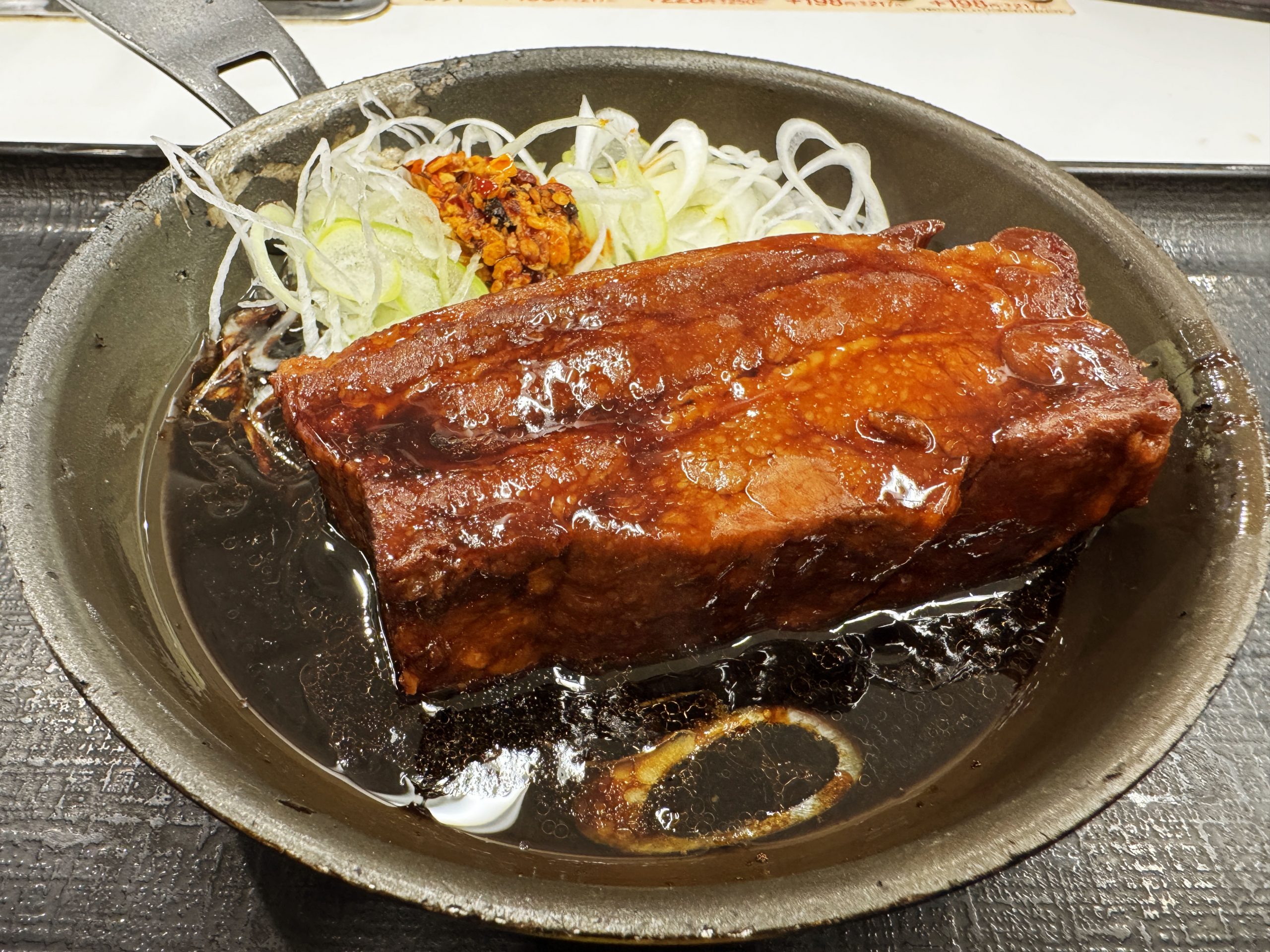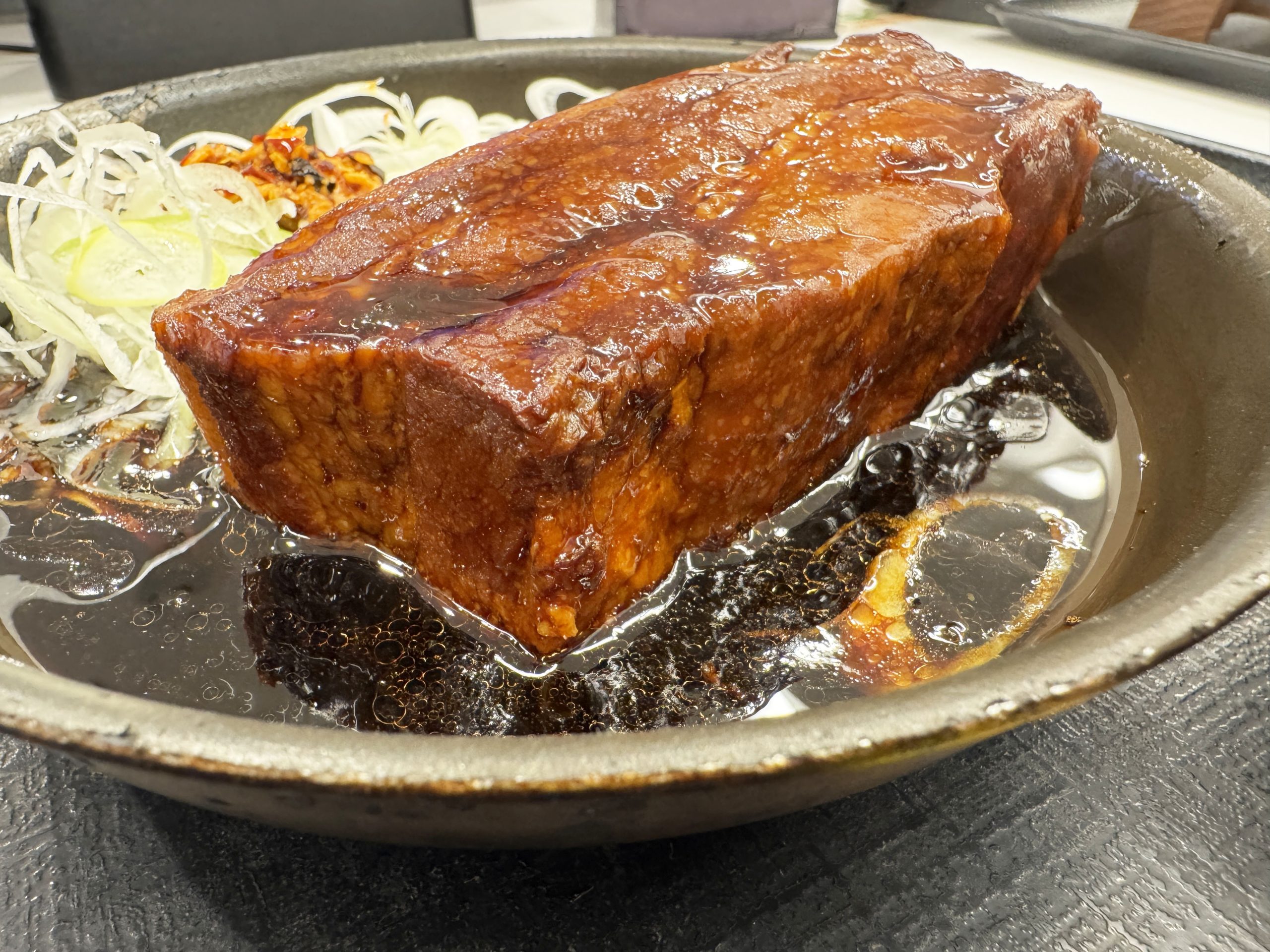 その厚切り豚角煮定食ですが、ライスにのせると、より巨大さが強調されます。