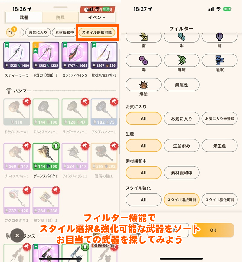 スタイル強化は以下の次元変異モンスター(ディアブロス、フルフル、レイギエナ、マガイマガド、イビルジョー、ラドバルキン、ドスギルオス、ボルボロス、トビカガチ、ジュラトドス、アンジャナフ、リオレイア、ベリオロス)の素材で生産、強化する武器のみが対象となってる。