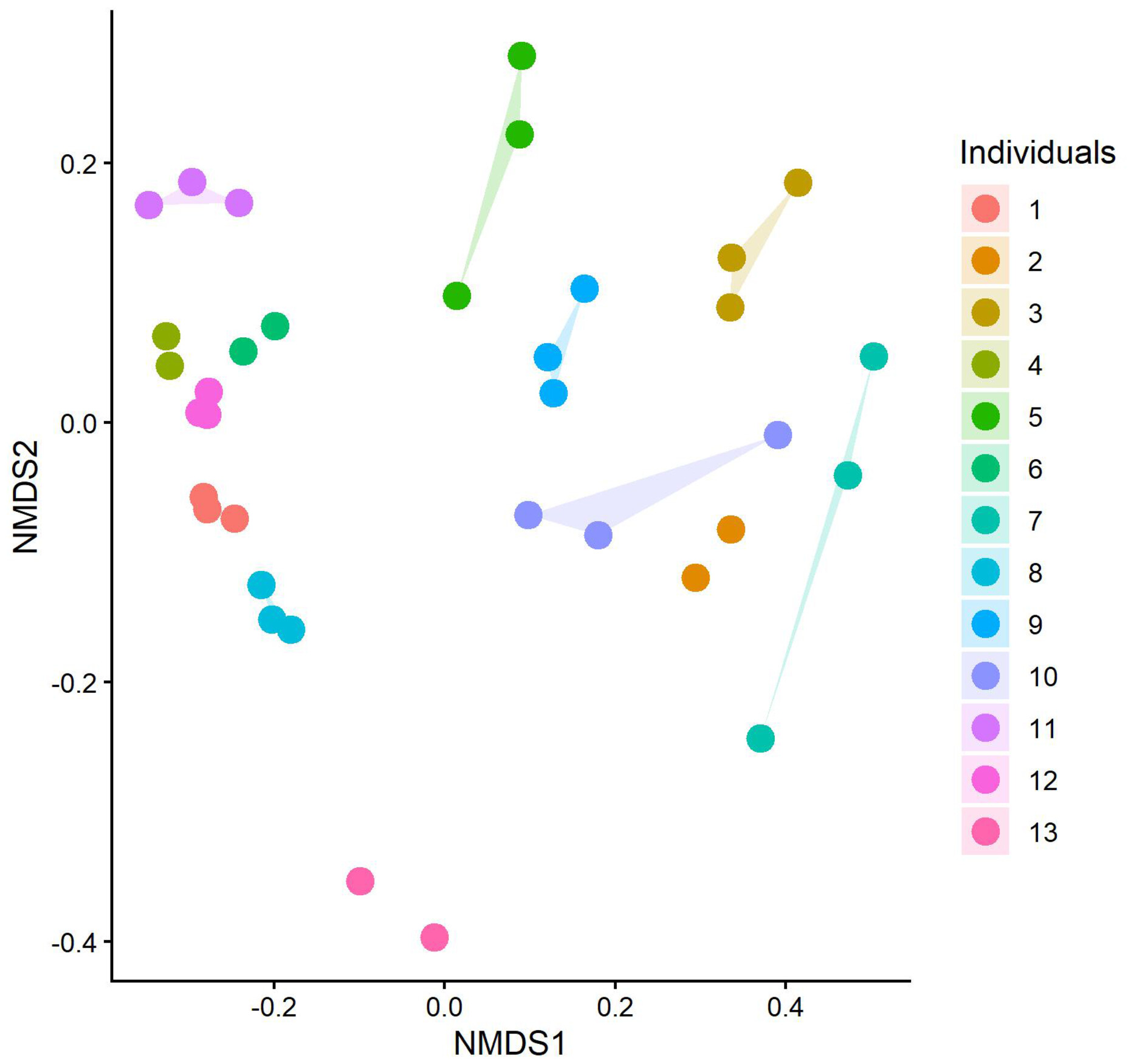 【▲図3: 化学分析にかけられた13個のウォンバットの糞から検出された分子をプロットしたもの。簡単に言えば、違う色の円があまり重なっていないことから、それぞれが違う臭いをしていることを表しているのよ。 (Credit: K. McMahon, et al.) 】
