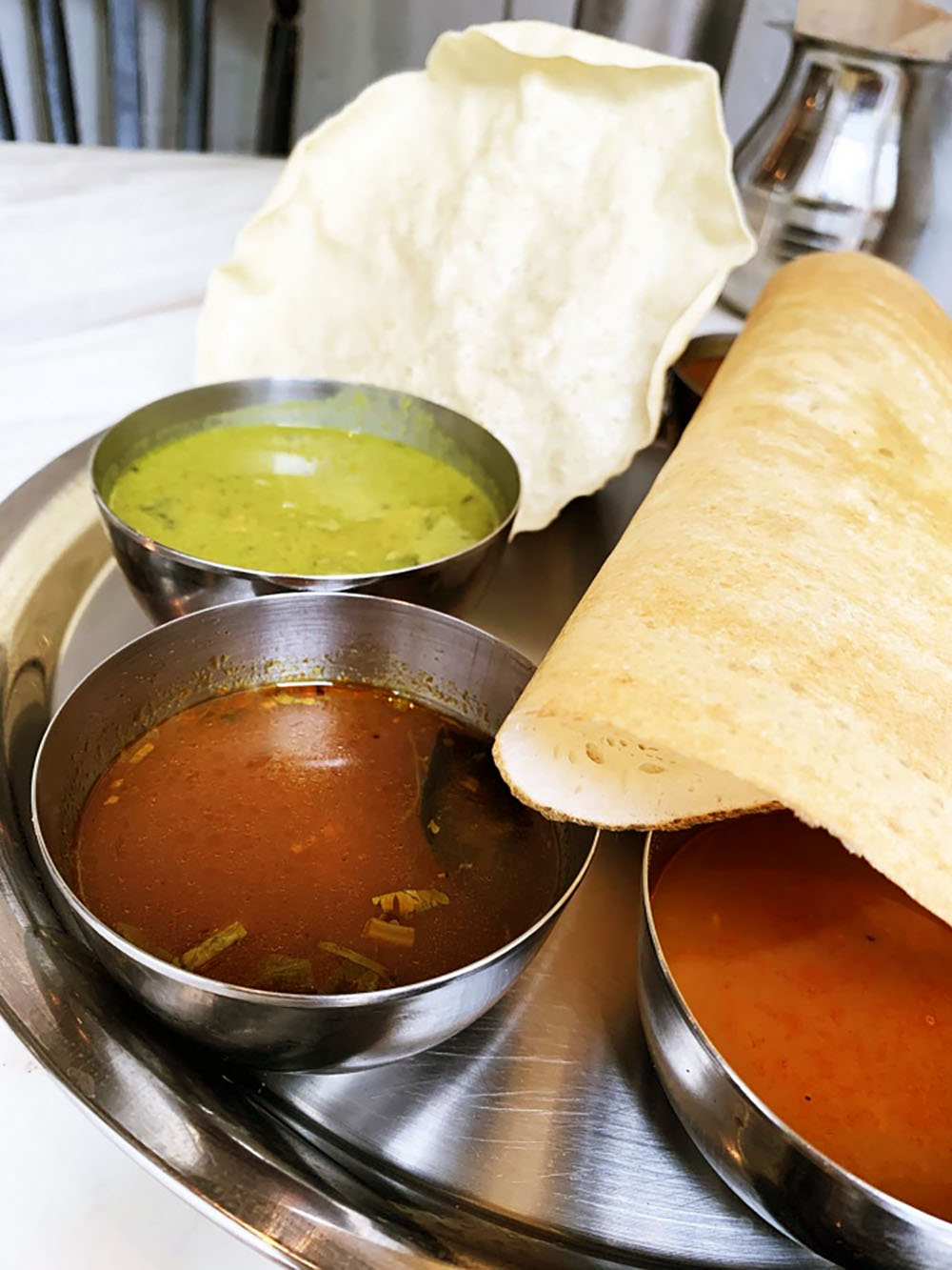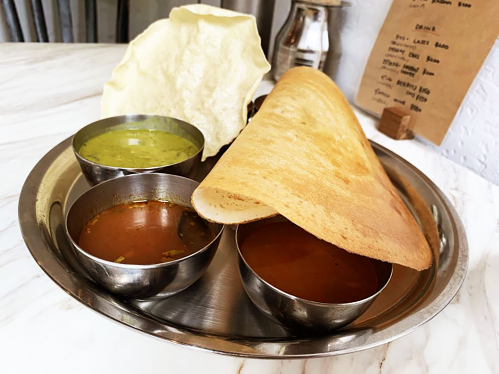 ナンはないが南インド料理としては定番のドーサかバトゥーラ(揚げナン)からパンを選ぶことができ、どちらを選んだとしても生地の香ばしさがカレーのスパイスの旨味を盛り上げて絶品。もし興味がわいたならば、カレーとカレーを混ぜて生地を浸して食べてみてほしい。