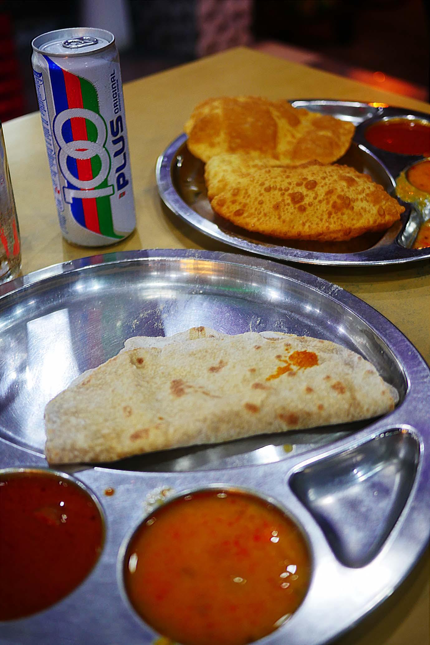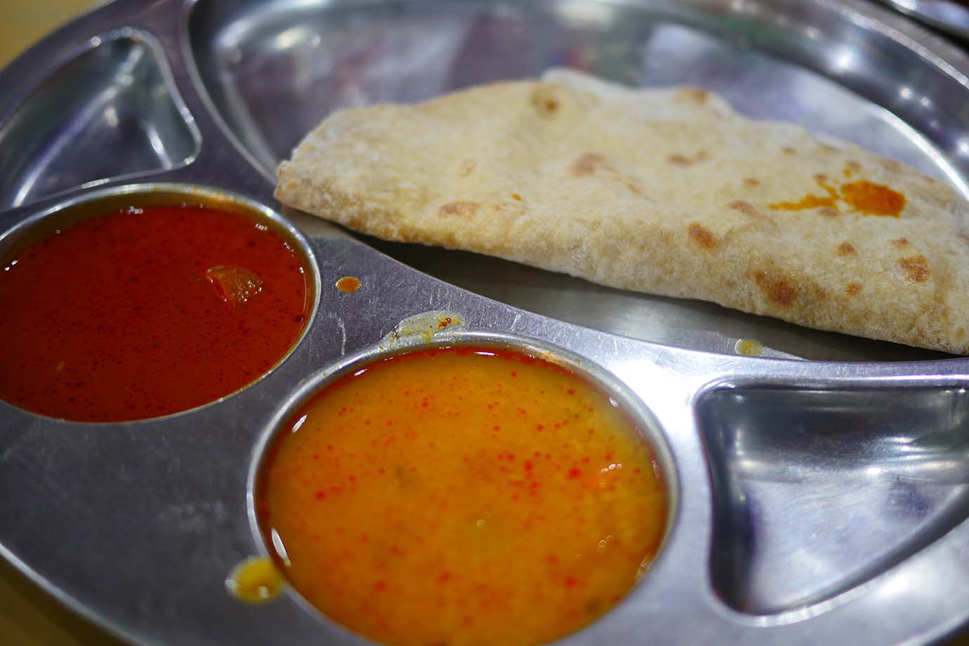 インドパンはいろいろな種類が用意されているが、今回はパロタをオーダー。そこに豆カレーや野菜カレー、スープなどが盛られる。食べ放題なので、どんどんカレーが出てきた。パンも「いらない」と言うまで追加される。この店に来て満腹にならない人はいない。