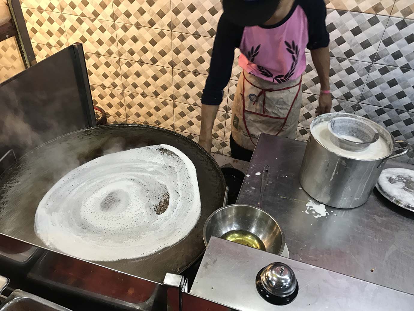 料理の美味しそうな薫りが漂っていて、早く食べたい気持ちが高ぶる。価格は110ルピー(約190円)です。待つ間に手を洗う。お店の入口に手洗い場があるので、そこで洗う。この手洗い場は、食べ終えたあとも使える。