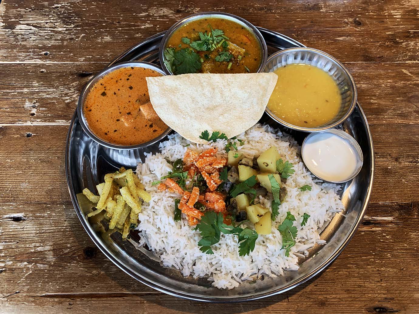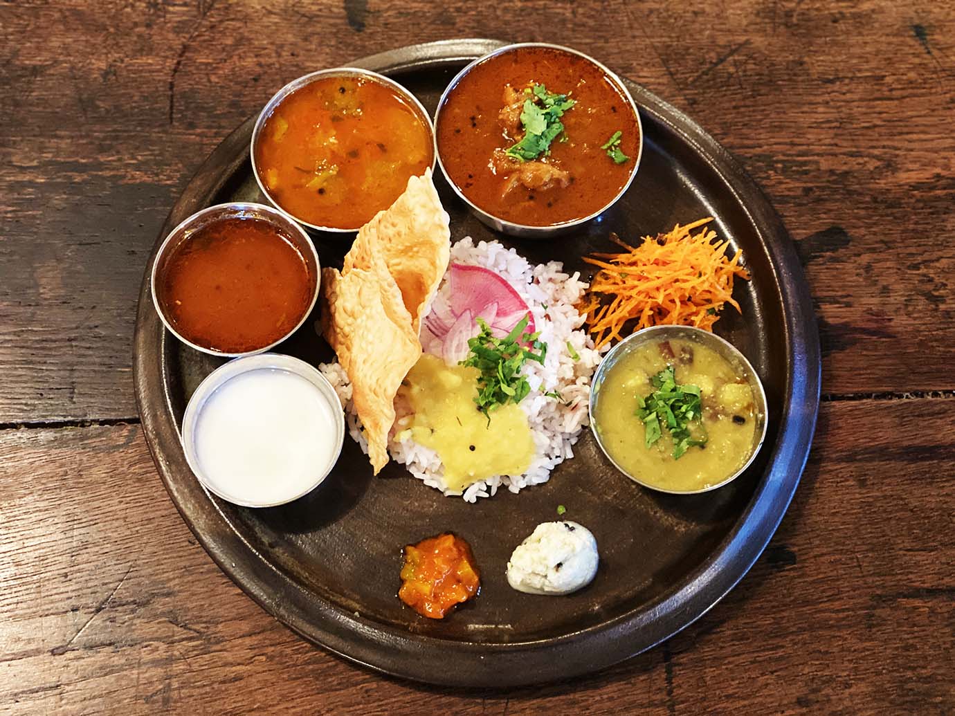 民家っぽい店舗の横道から庭に行き、庭で靴を脱いでから、縁側から入る。まさかの縁側イン。民家っぽく、庭があり、縁側もある。確実に民家的。ミールスをオーダー。さまざまなカレーや総菜がセットになったもの。サンバル、ラッサム、カレー、ポリヤル、ダルフライ、アチャール、チャトニ、バスマティライス、パパドがひとつの皿に盛られている。実においしそうなスパイスの薫りを放っている。丁寧に作っている感がハンパない。カオスに盛られているようで、極めて丁寧に、気を使って盛られている。もはやアート。