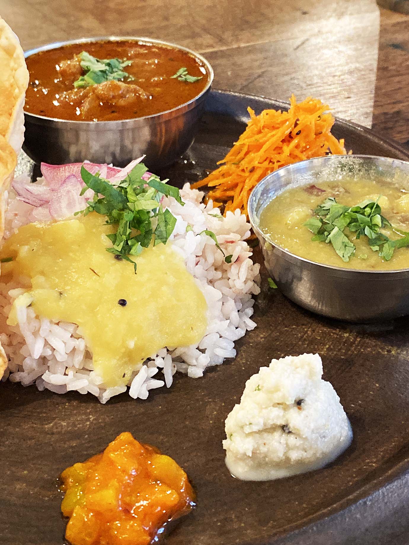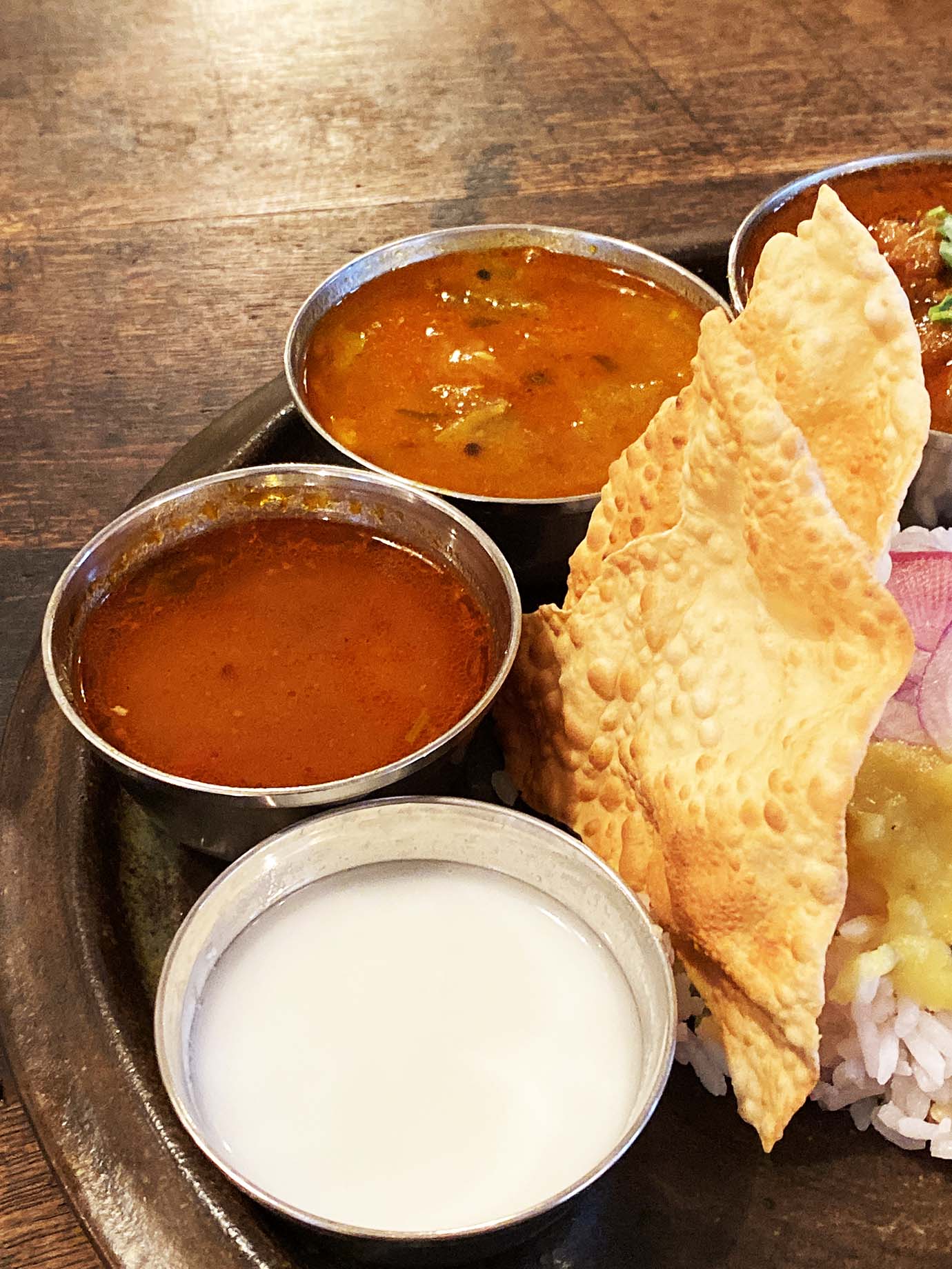 カレーが三種類ついてくるが、ラッサムやスパイシーなスープのサンバルも他のカレーとミックスして食べてみるのも楽しい。あくまで私見だが、南インドで食べるインドカレーよりも旨味が深いと感じたのは気のせいだろうか。スパイスが食材から旨味と甘味を引き出しているようにも感じた。「三燈舎」(東京都千代田区神田小川町3-2)。