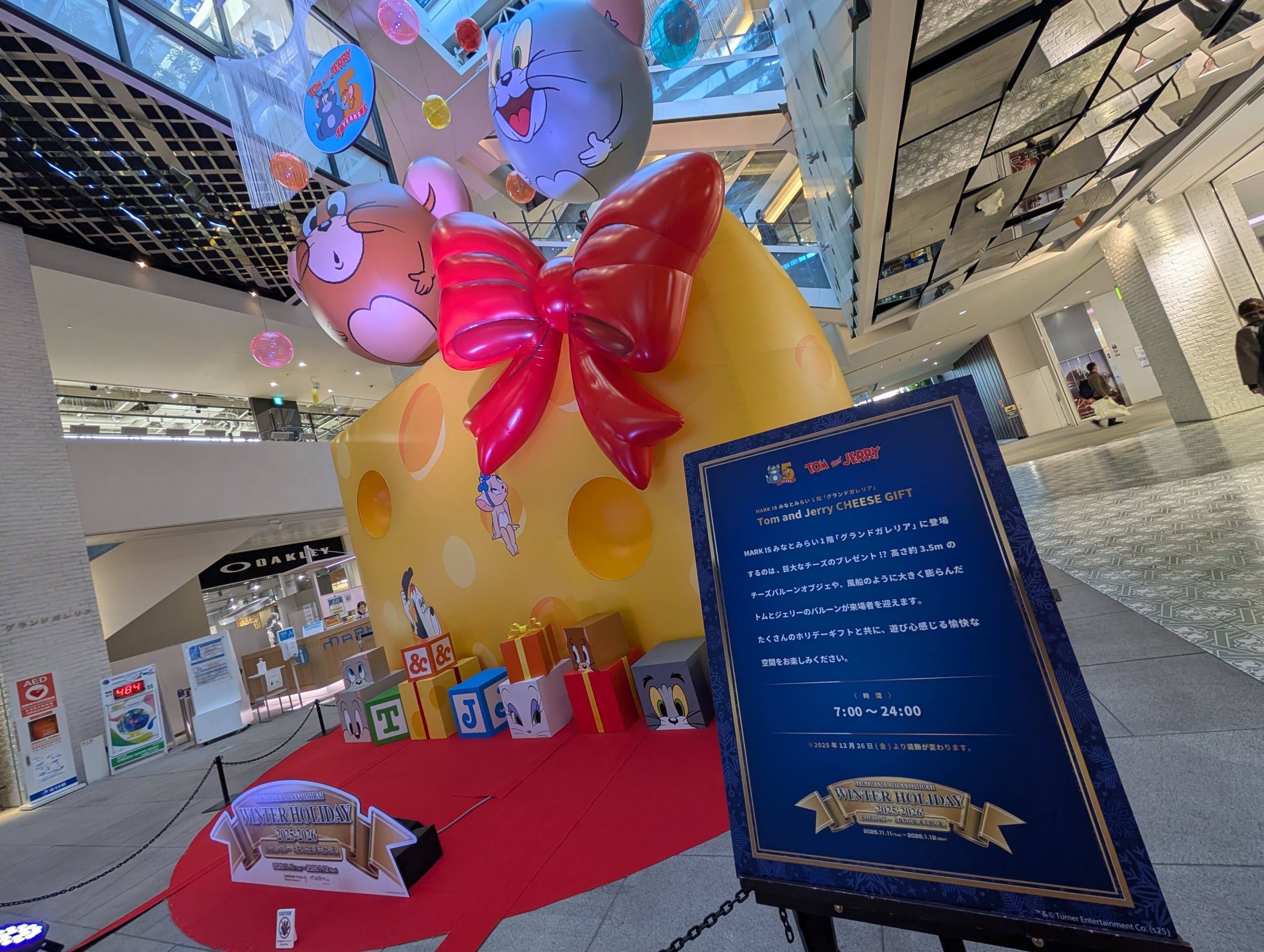 MARK IS みなとみらい 1階 グランドガレリアには、ホリデーギフトが大集合した、高さ約3.5mの巨大バルーンオブジェ「Tom and Jerry CHEESE GIFT」が登場。そのふもとには「トムとジェリー」、それぞれの顔の福笑いパネルも。ふたりのおもしろおかしい表情が楽しめました。