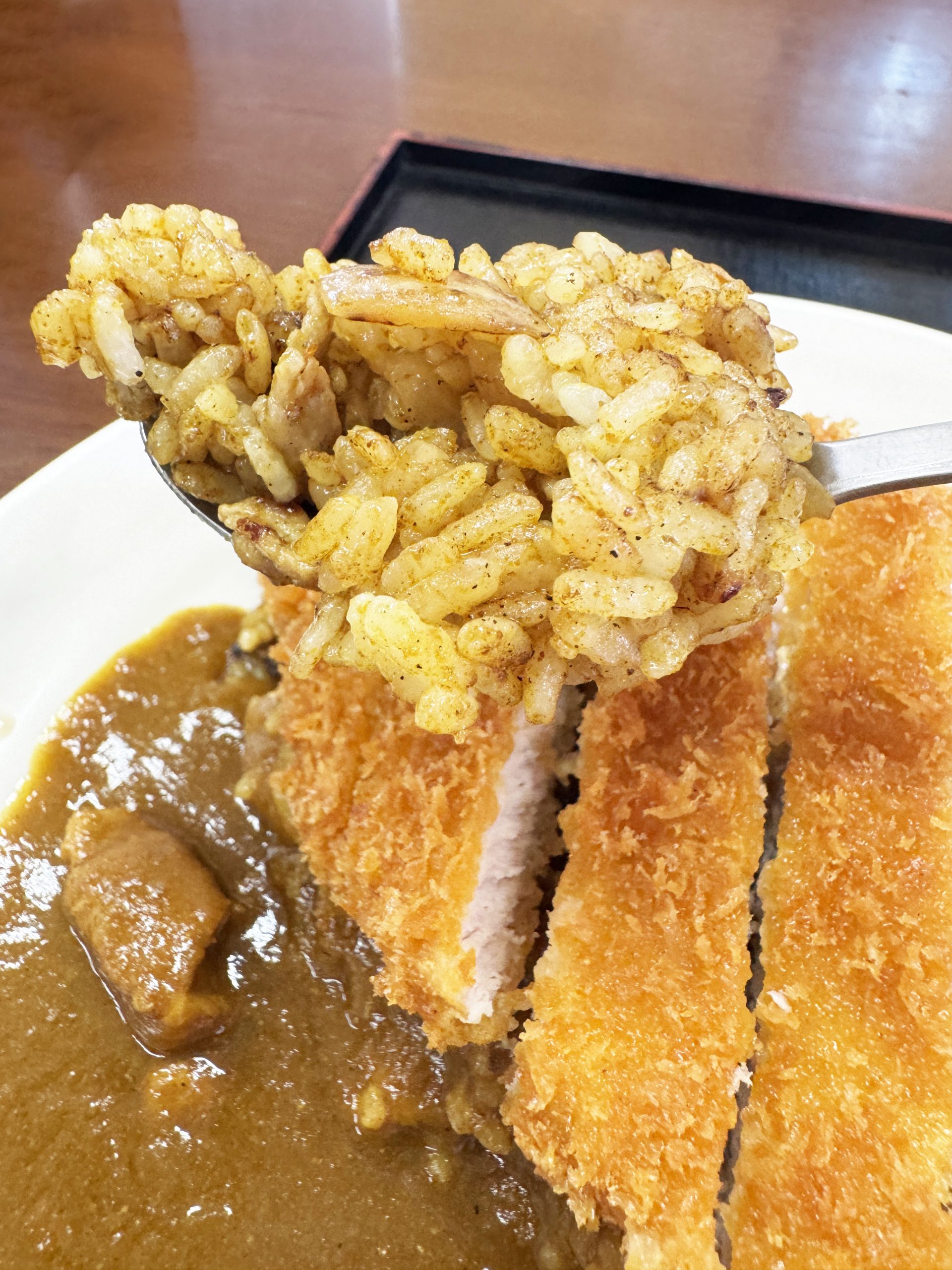 まず衣がザクザクでありながら硬すぎず、シャリッと崩れて旨味と脂を大放出。そのエキスがふわっとやわらか食感の豚肉に浸透し、スパイシーながらコクのある甘味が楽しめるカレーと融合。そのおいしさを感じさせる機序が完璧なのだ。もちろん、カレーとシンクロ率が高めなライスの炊きあがりも高評価を与えたい。