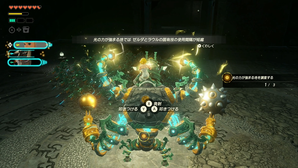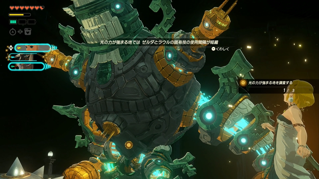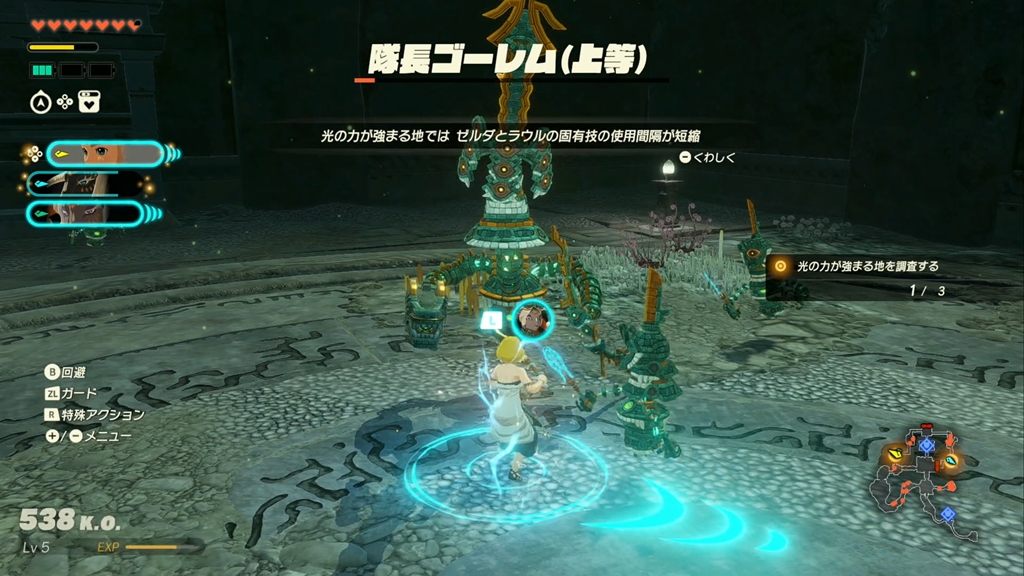 加えて、近くのキャラと協力して繰り出す「シンクストライク」は、キャラの組み合わせで技が変わるので、パーティ編成の妙味が増す。特にゼルダとミネルで「シンクストライク」を繰り出せば、「ティアキン」本編のように巨大なゴーレムに乗り、敵を豪快にボコスカ殴れる。