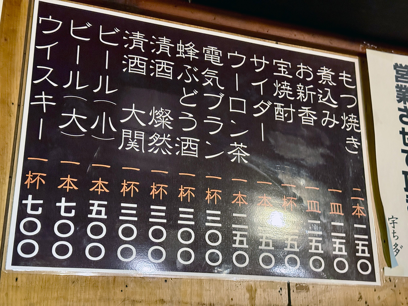 店内にあるメニューはこの1枚だけ。看板商品のもつ焼きが2本で250円なことはわかりやすいですが、どんな部位があるのかは一切書かれていないのです。