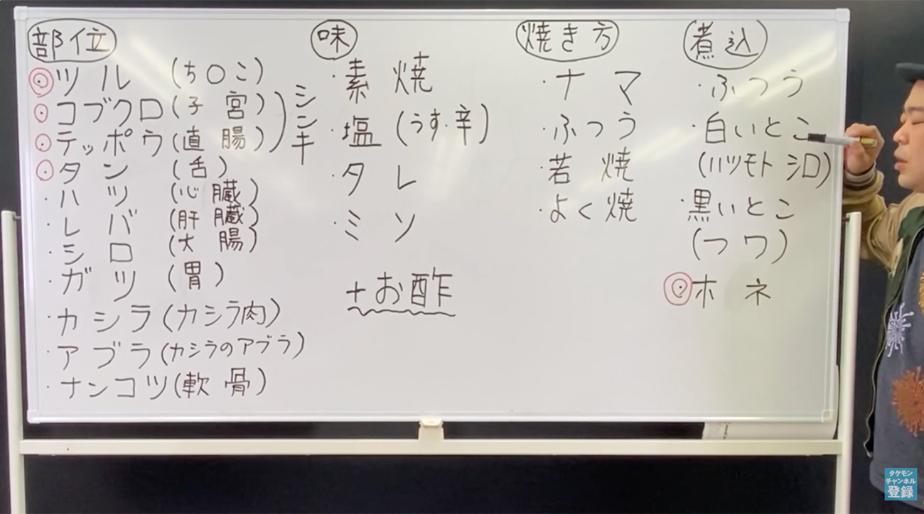 こちらの画像が「宇ち多゛」にある部位と、その味付けと焼き方の種類。こちらを組み合わせ「カシラタレヨクヤキ」といった具合に注文をします。ラーメン二郎の「ニンニクヤサイアブラマシマシ」といった感じの“コール”とそっくり。