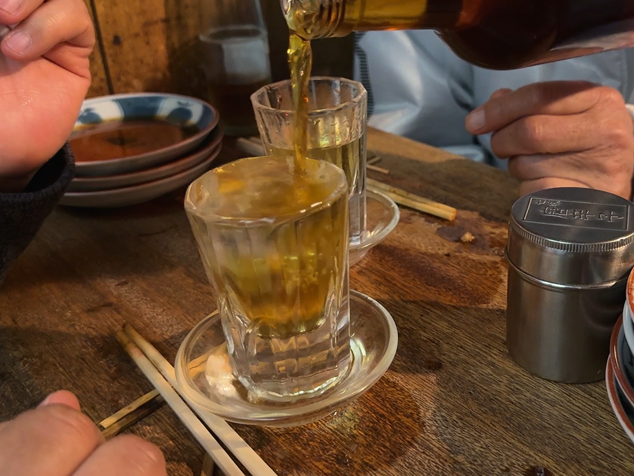 うめ割りは焼酎を注いだグラスにうめシロップを入れてくれるというものなのですが、注文すると焼酎を卓上でほぼグラスいっぱいまでドバドバ注いでくれます。これ、うめシロップが入る隙間なんてないのでは……??