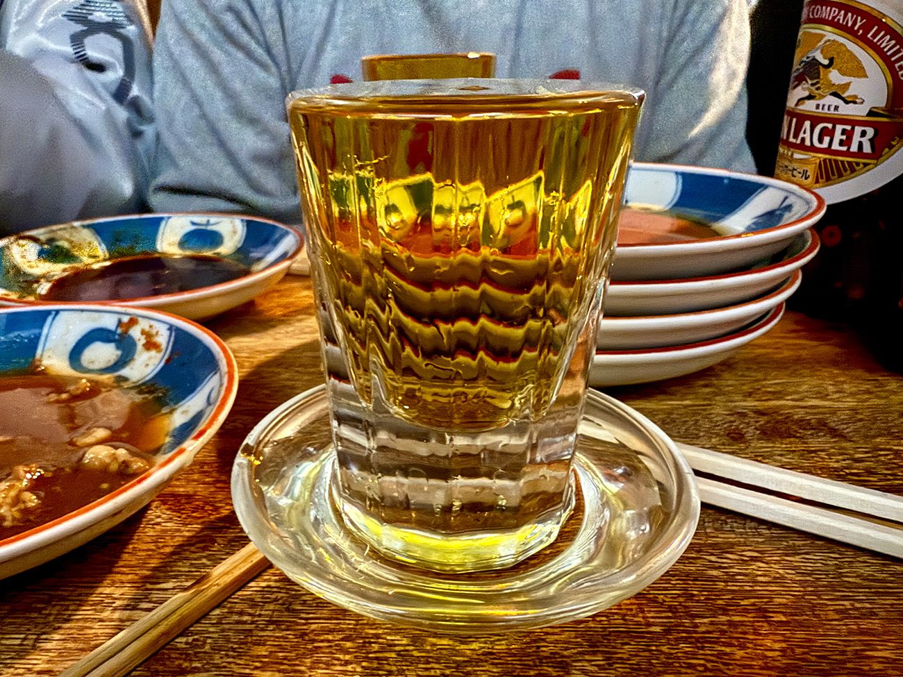 こうして表面張力と受け皿に甘えたうめ割りのできあがり。こんな割り方をしてるから実質ほとんど焼酎をストレートで飲んでいるようなものなんだけど、うめシロップも濃厚だから、濃縮された梅酒のような味わいで意外にも飲みやすい……!