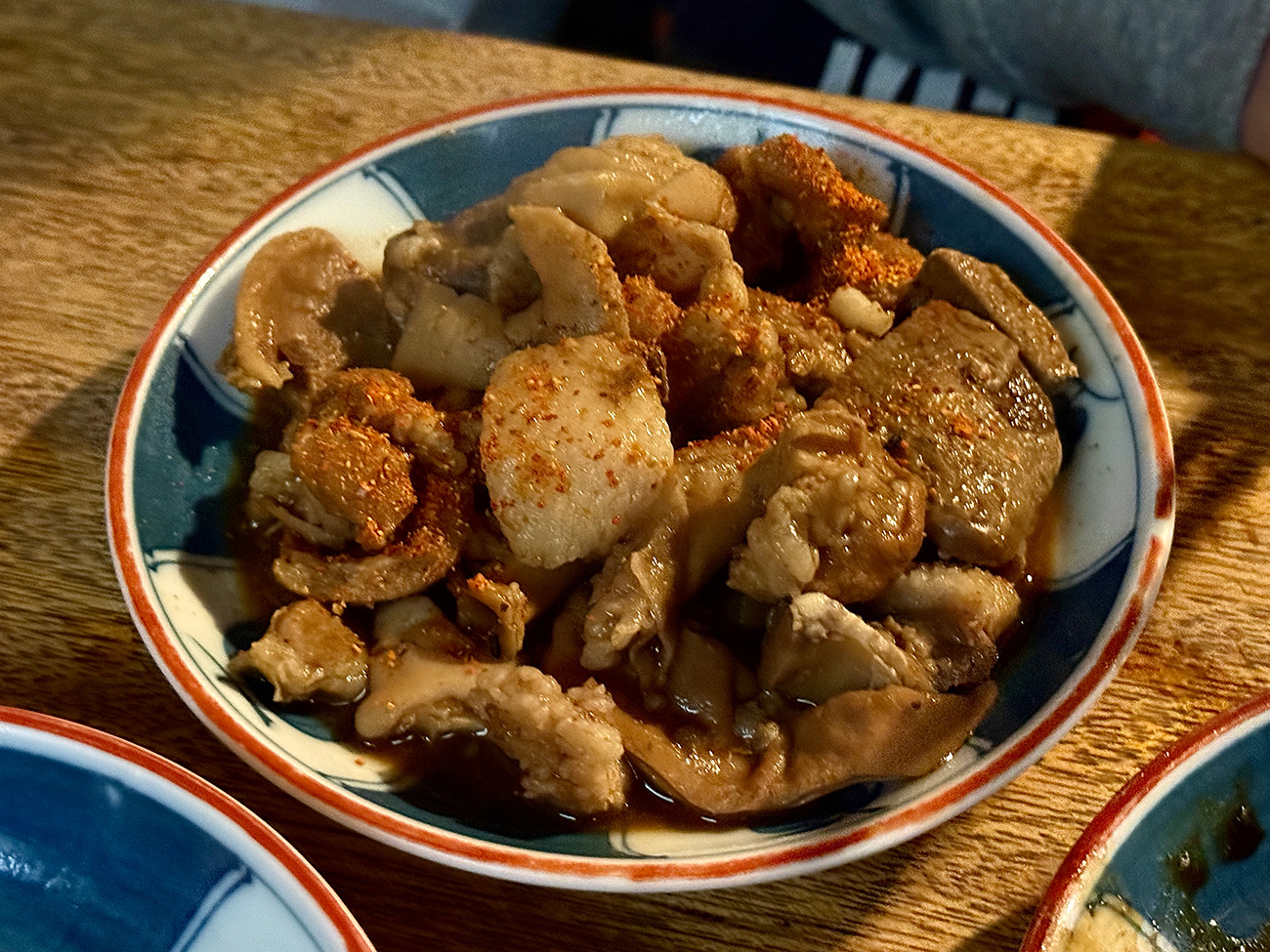 席について瓶ビールで労をねぎらいつつ、最初に食べたのは「シンキ(オス)」と呼ばれるコブクロとテッポウのセット。こちらは希少部位の一種で、いつも早い段階で完売することが多いそう。しかもこの日は先着順で残念ながらありつけなかった「ツル」「ホネ」といった希少部位もあるのだといいます。