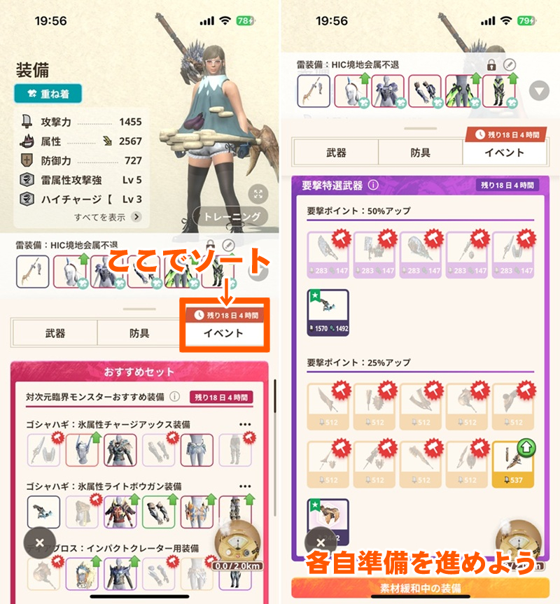 武器種やオススメの防具構成などは、ひと目でわかるようゲーム内に専用のコーナーが設けてあるので役立ててほしい。