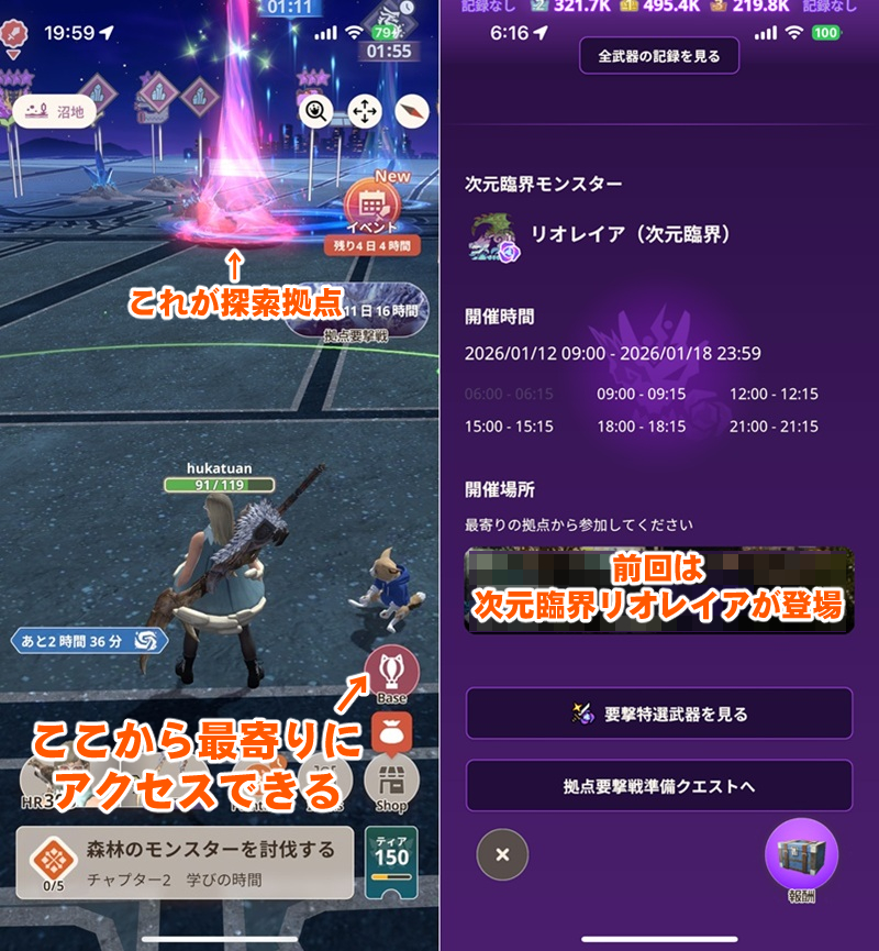 位置情報ゲーム『モンハンNow』では、約1ヵ月にわたるピリオドの最終週に探索拠点というスポットで、特殊なモンスターに挑む協力型のコンテンツ“拠点要撃戦”というものがある。
