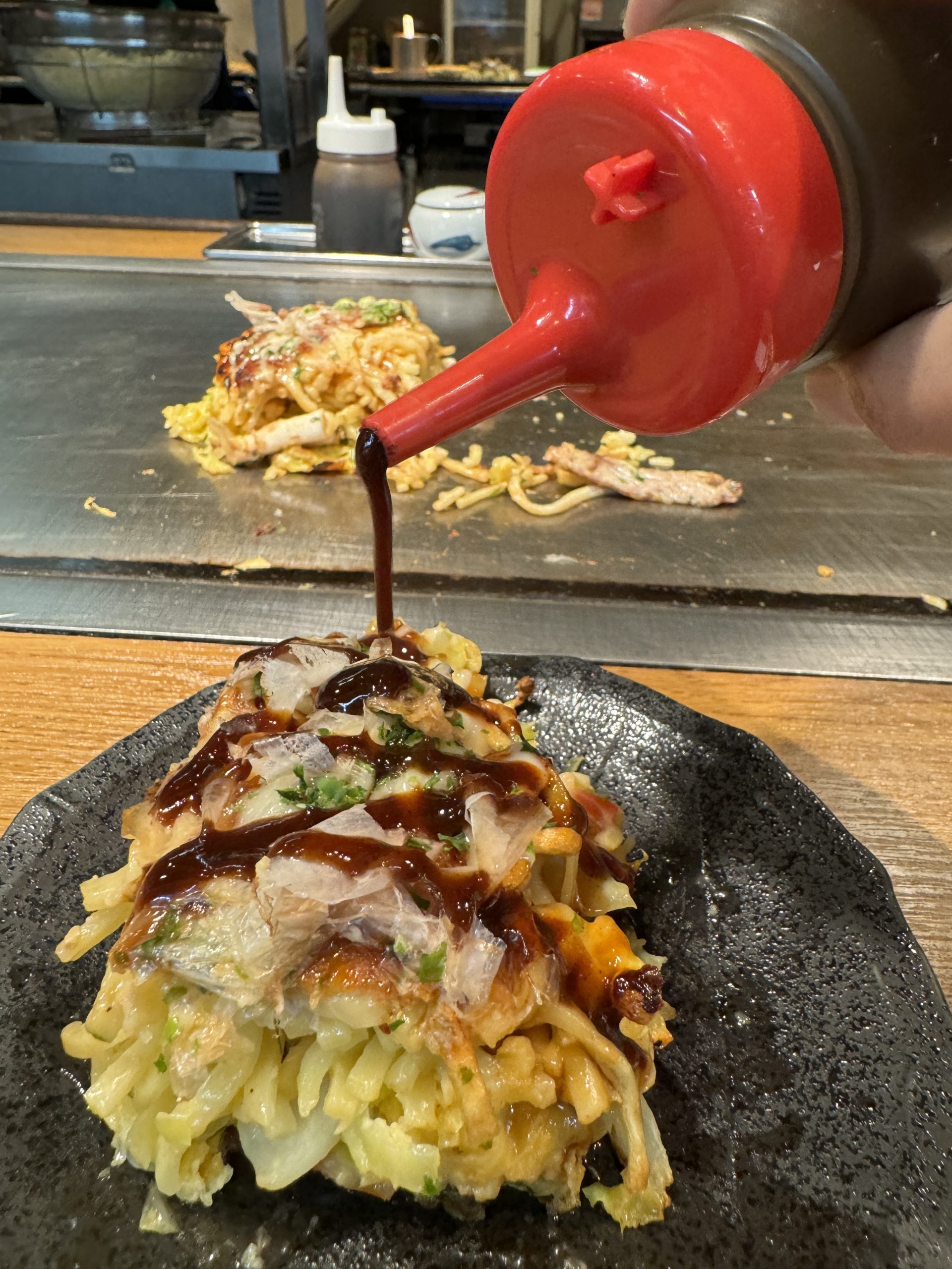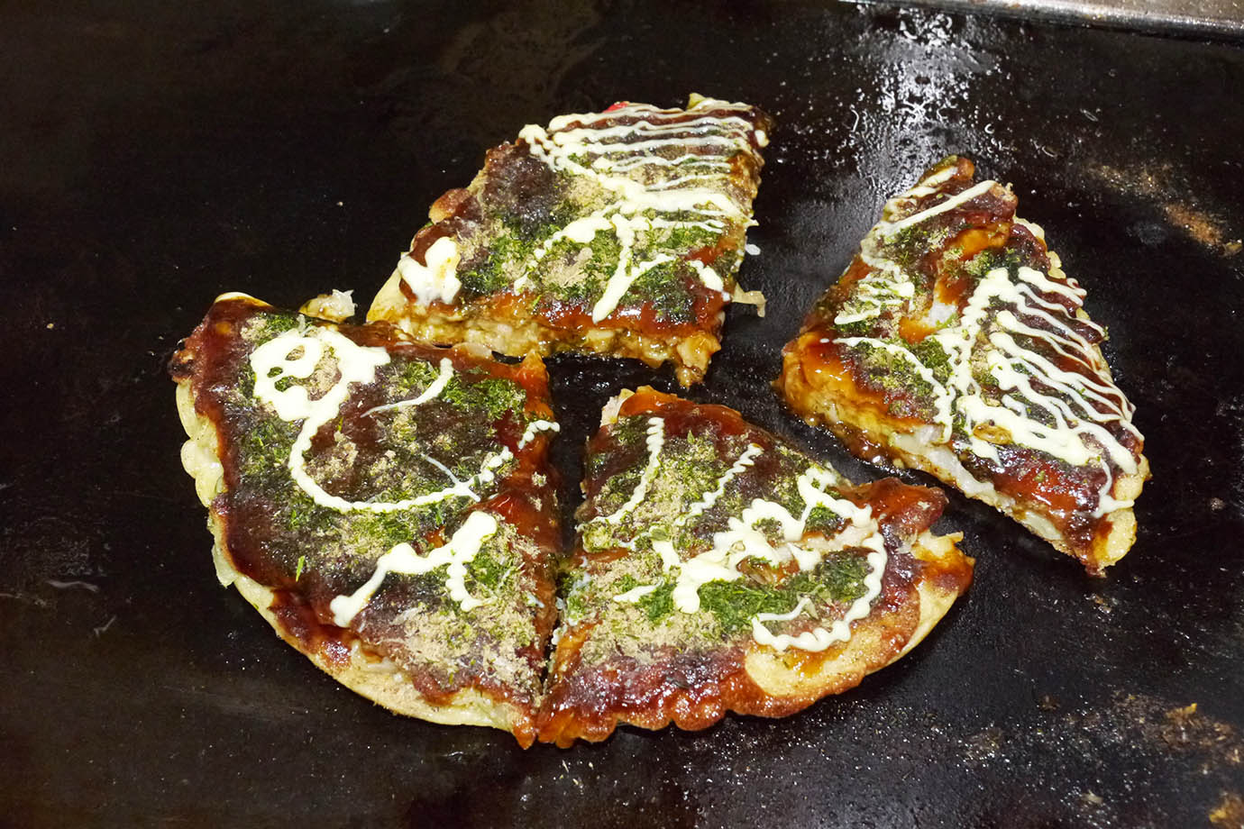 地域住民にすこぶる評判が良い店。ここは味も素晴らしいし店員の人柄も良いと評判。今回はミックスモダン焼きをハーフ&ハーフでいただく。ハーフ&ハーフとは、半分にソースとマヨネーズ、もう半分に醤油をかける食べ方のこと。