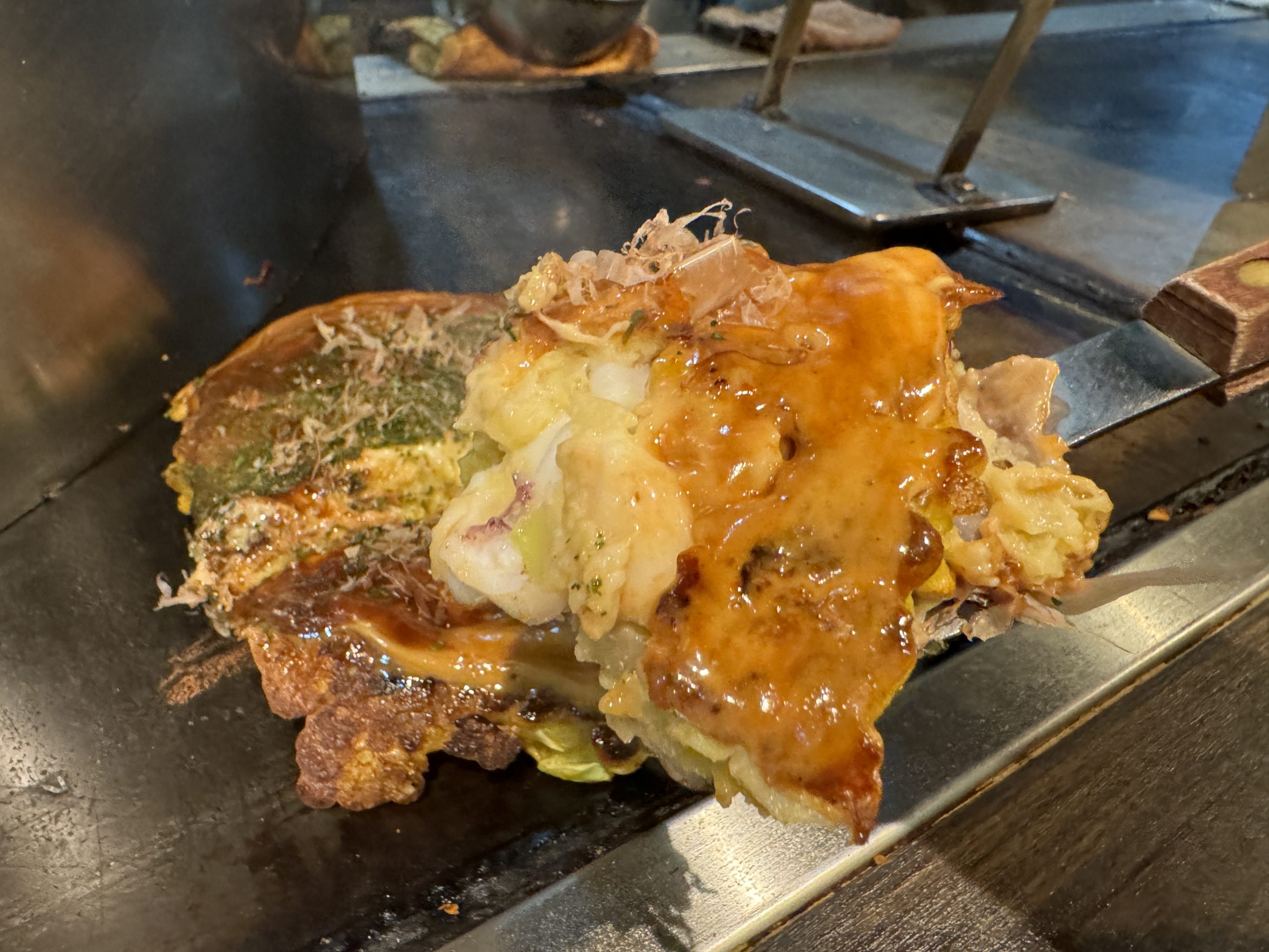 なにより特徴的なのは、玉子感が強い点。厚みある玉子がお好み焼きのトロトロ感を際立たせてくれるので、他店では味わえない魅力といえるが、定番のお好み焼きとしての要素もしっかりあるので、「安定の美味しさと」「新しい美味しさ」が楽しめる素晴らしきもの。