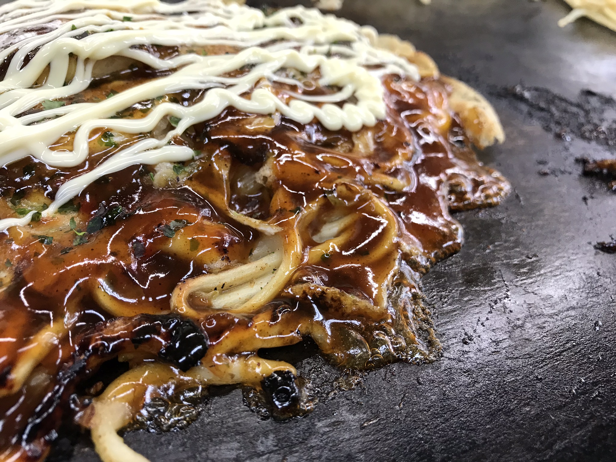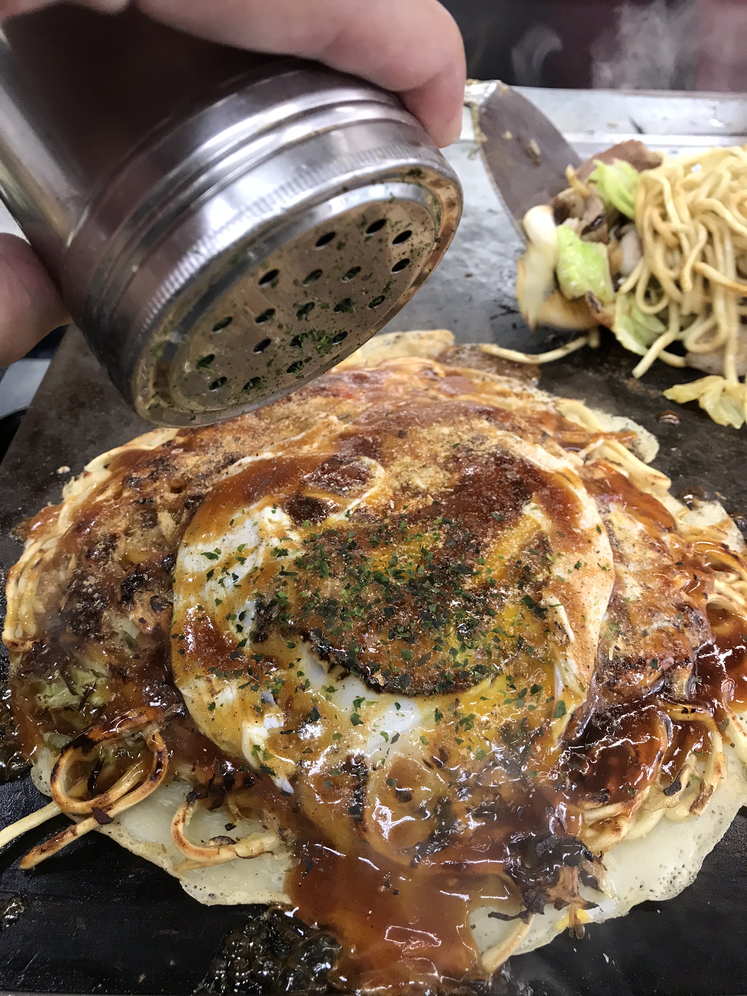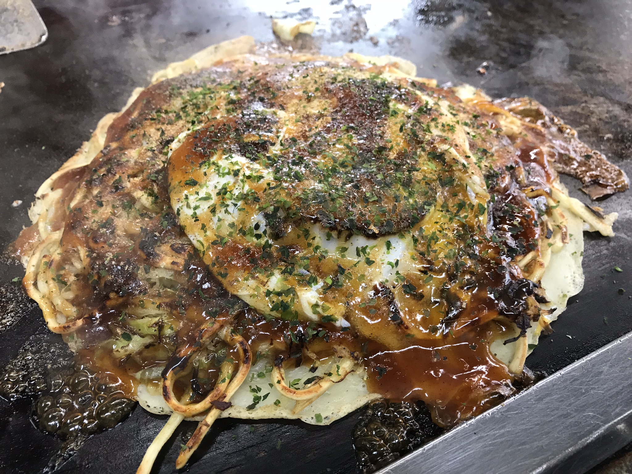 さっそく食べる。うんうん、これこれ、このソースの深い甘味が野菜と生地の旨味を盛り上げてくれるこの感じ、まさに旨味集合体! いや、旨味連続体とも言うべきかもしれない。だって、生地、麺、卵、野菜、空気、熱、すべてが旨味を猛烈に放出するのだから。美味しさが休む暇を与えてくれない。