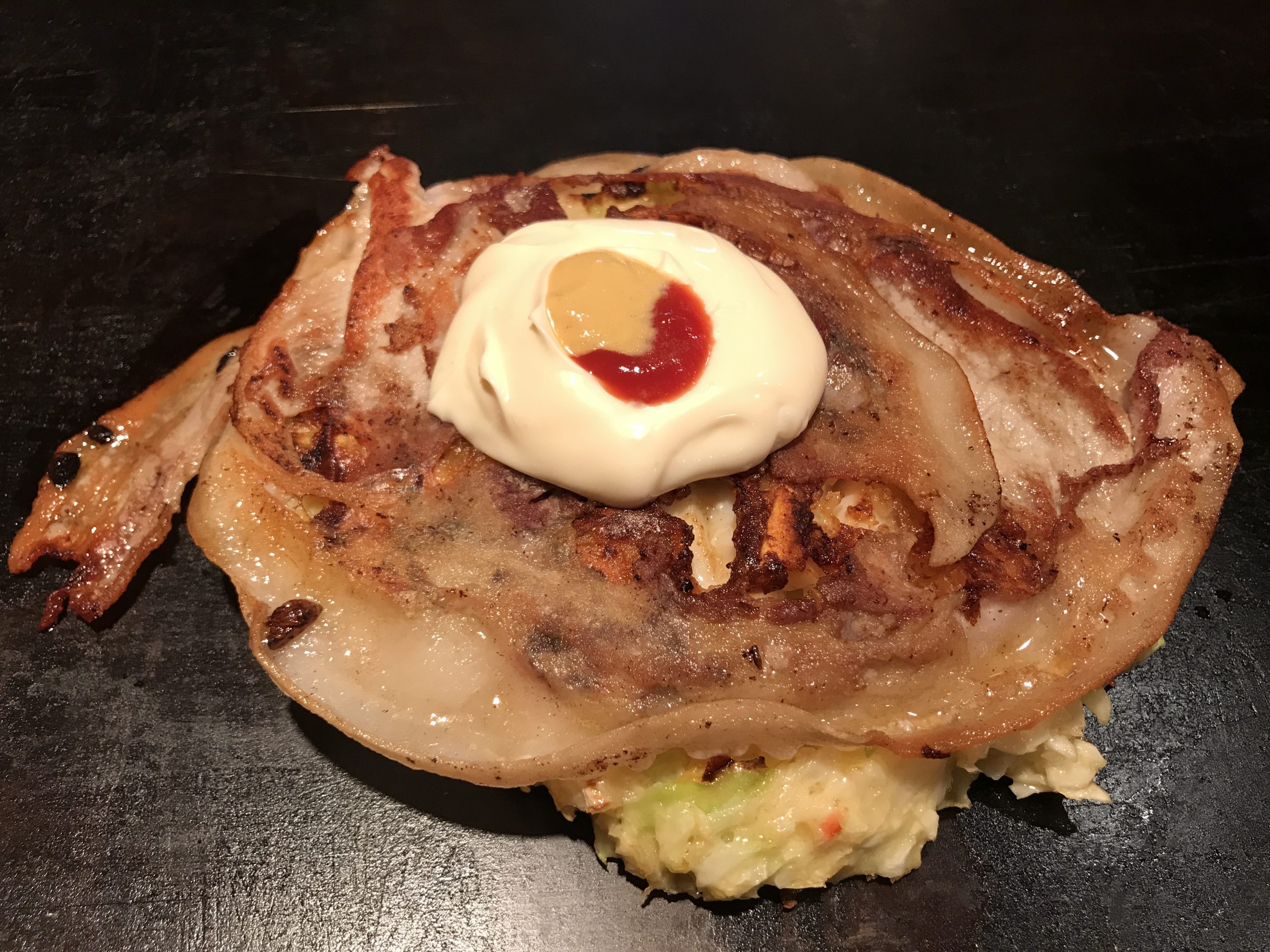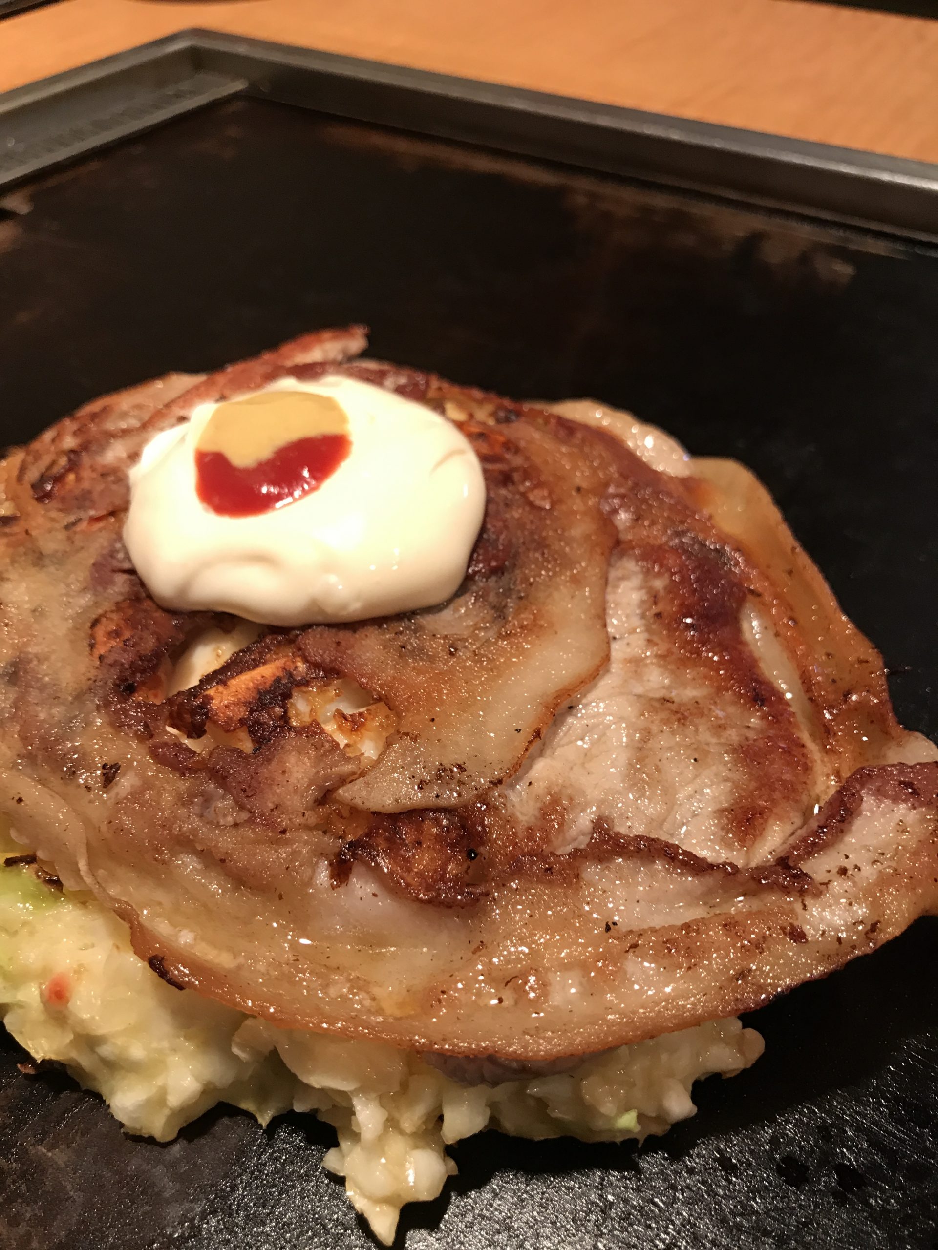 マヨネーズ、ケチャップ、マスタードが盛られた状態で目の前に出されるお好み焼き。卓上のソースをかけても良いが、まずは、そのまま食べてほしい。ソースも良いが、マヨネーズ、ケチャップ、マスタードだけというテイストも、激しくおいしい。特に酸味が際立ち、酸味が生地の甘味を盛り上げてくれるのである。