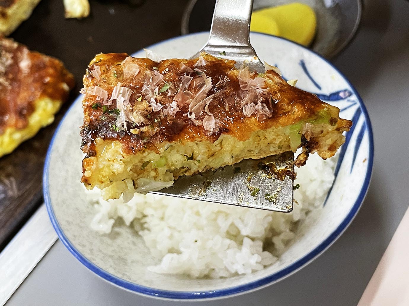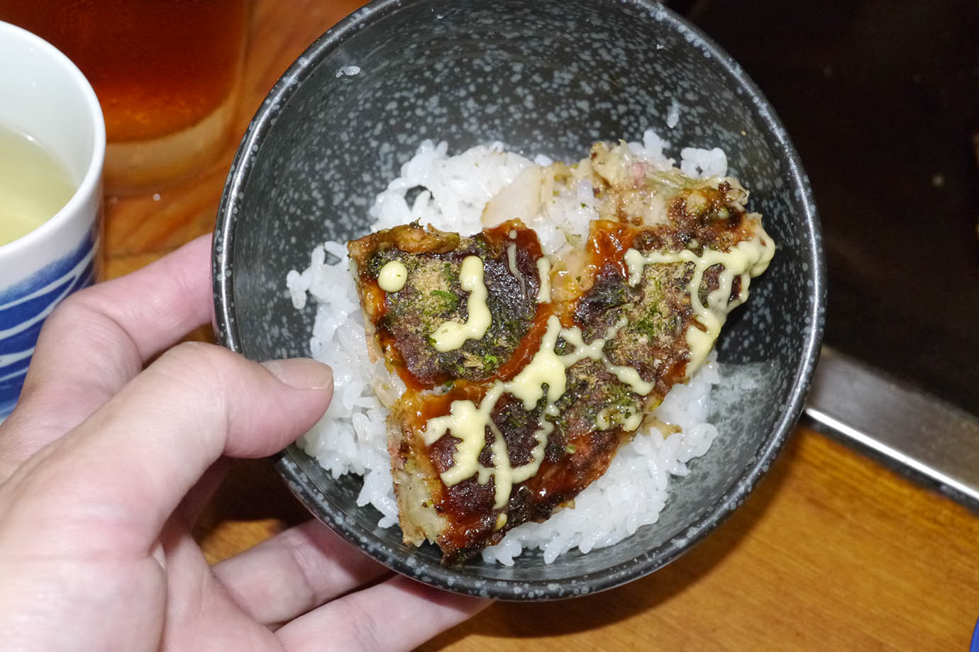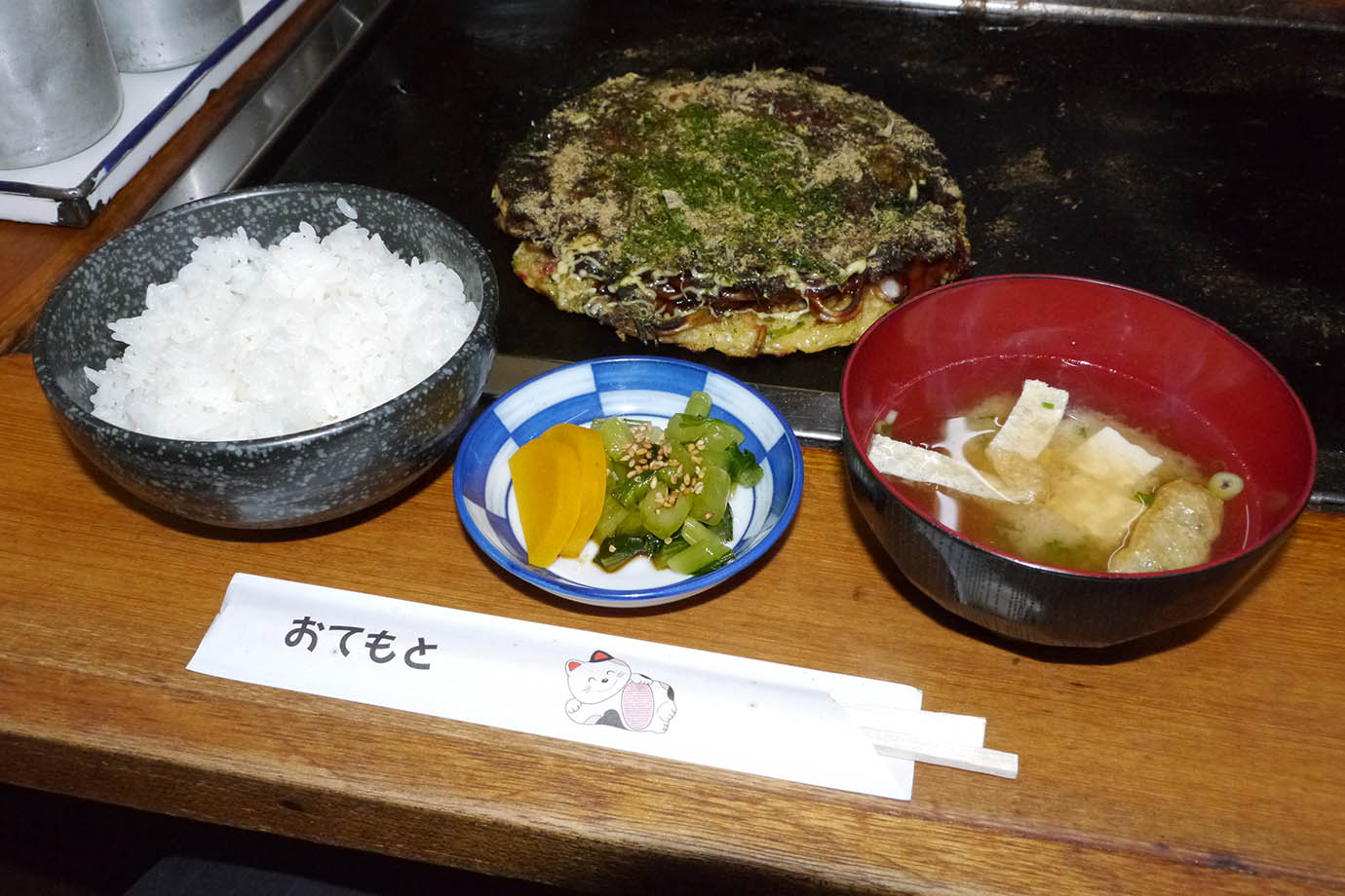 この店、お好み焼きが絶品な店として知られているのだが、お好み焼き定食も絶品。お好み焼き定食の食べ方は自由だが、特に美味しいと感じる食べ方が「お好み焼きをライスに乗せて食べる」というもの。