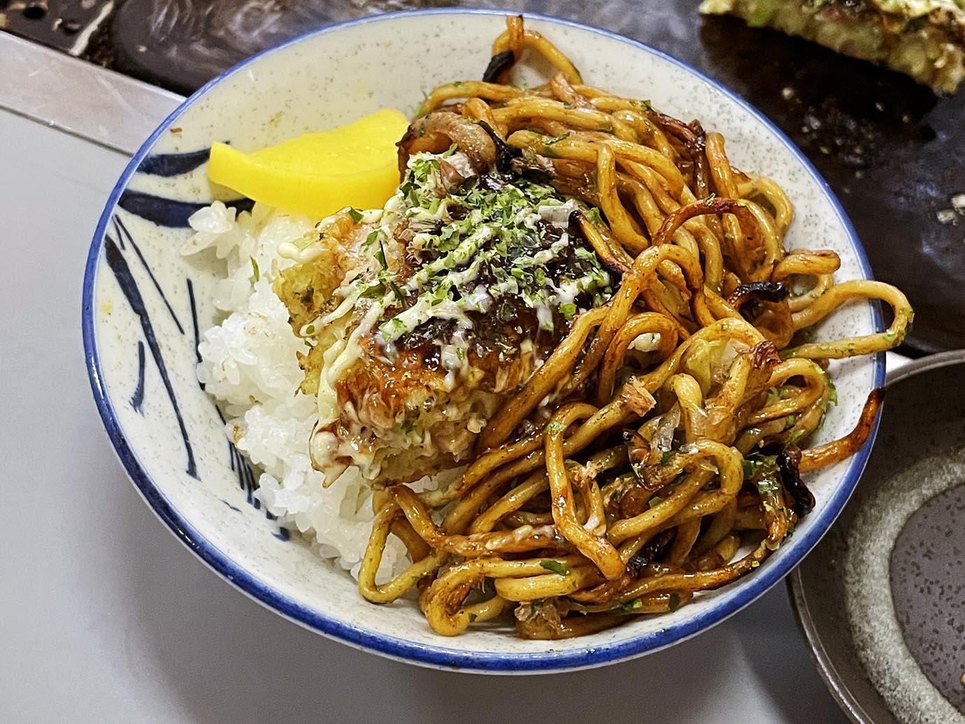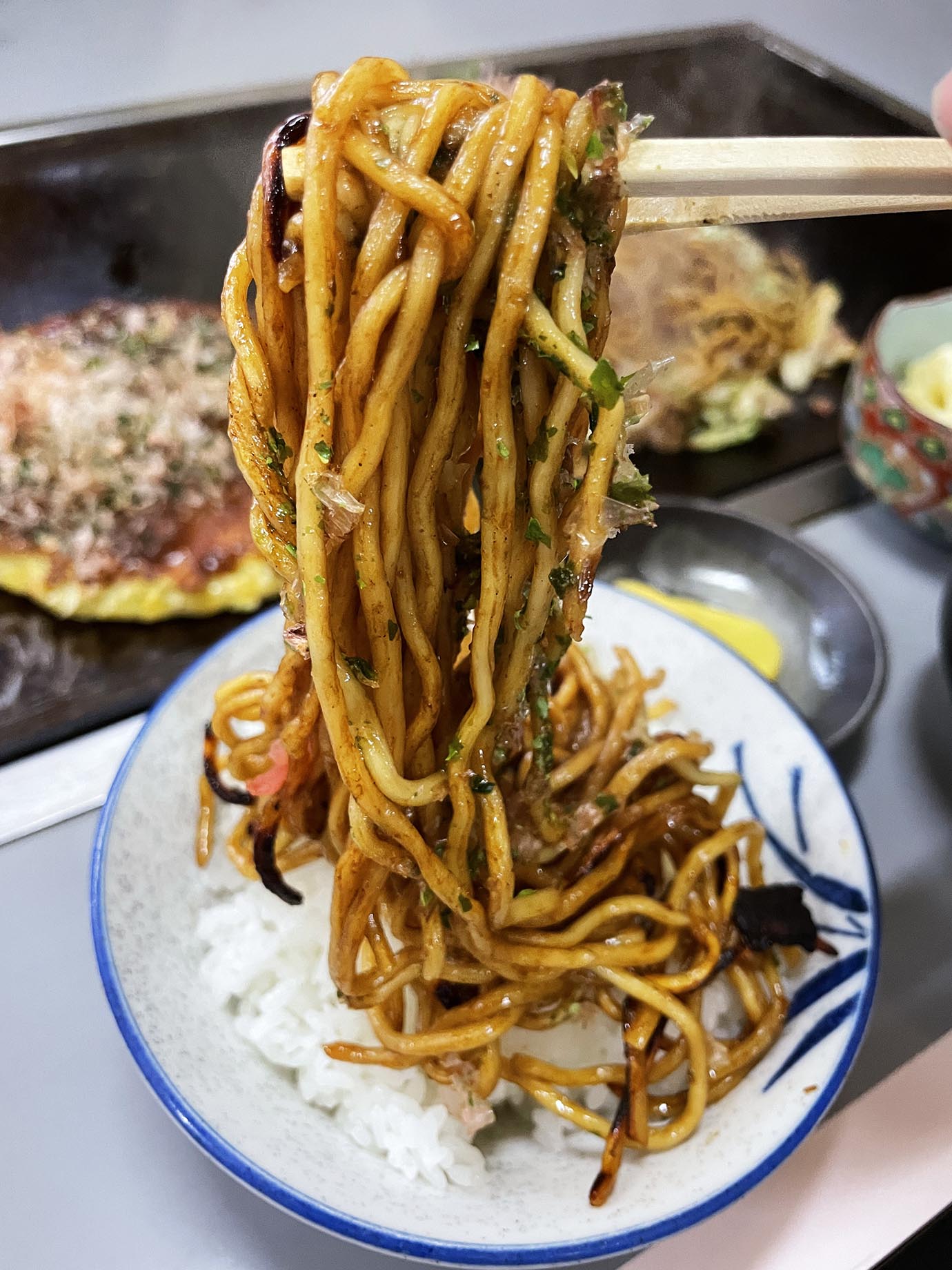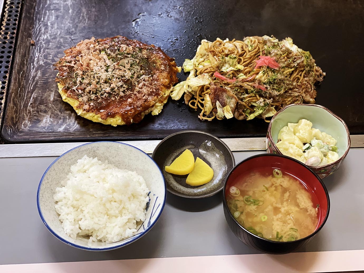 濃いめのソースに太めの麺が絶品の焼きそば。ごはんにワンバウンドしてズズッとすすり、間髪入れずごはんをガツガツ食べる。これがもう、たまらない。薫り豊かなソースと麺がライスの甘味と旨味を増幅させる。お好み焼きも同じようにワンバウンドして食べる。そして味噌汁をズズッとすすり、炭水化物のマリアージュ完成。完遂、完璧。
