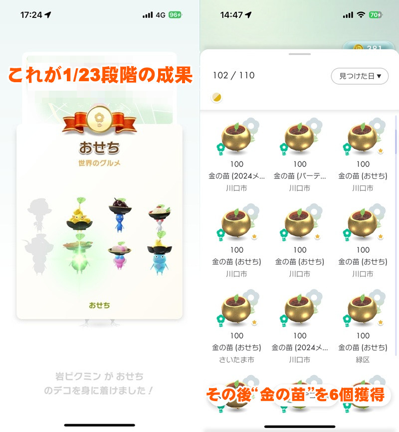 そんな状況をお伝えしてから6日が経過した本日(1/29)までに、実は“金の苗”を6個も獲得。