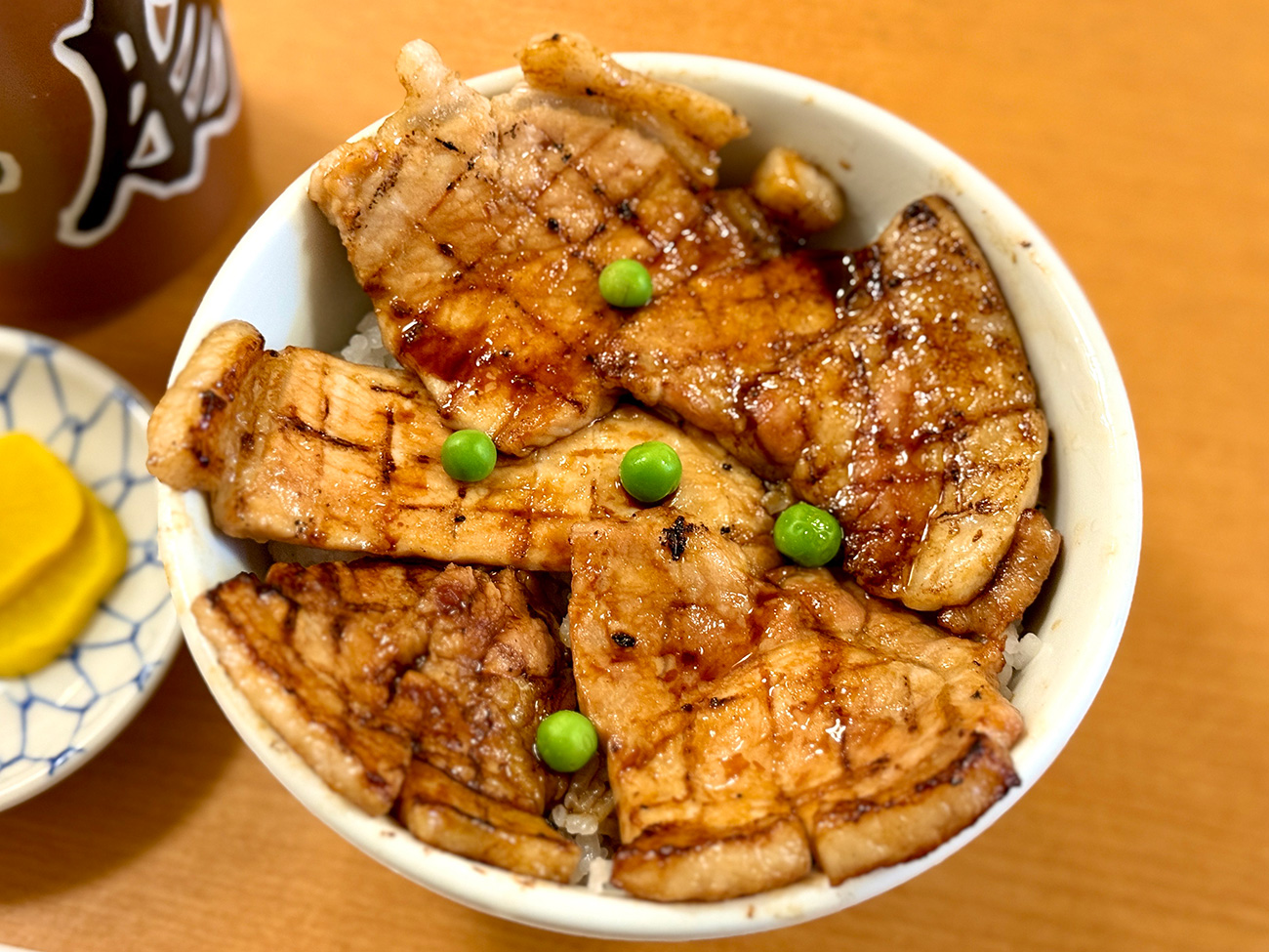 肉厚ジューシーな豚バラ肉と甘辛いタレ、そしてこんがりと香ばしい風味が実にごはんと合う! いやあ、本場の豚丼は何度食べても最高です。大満足。