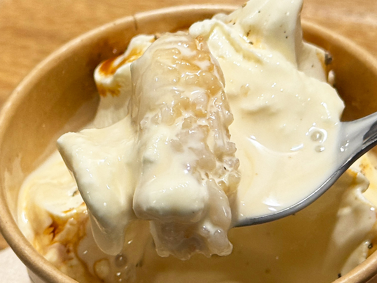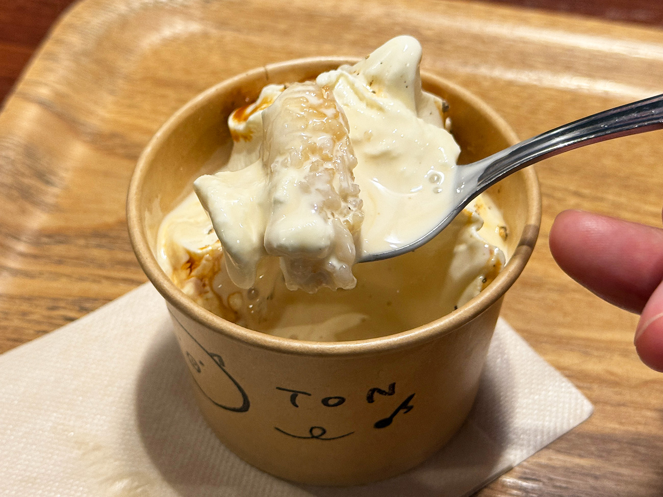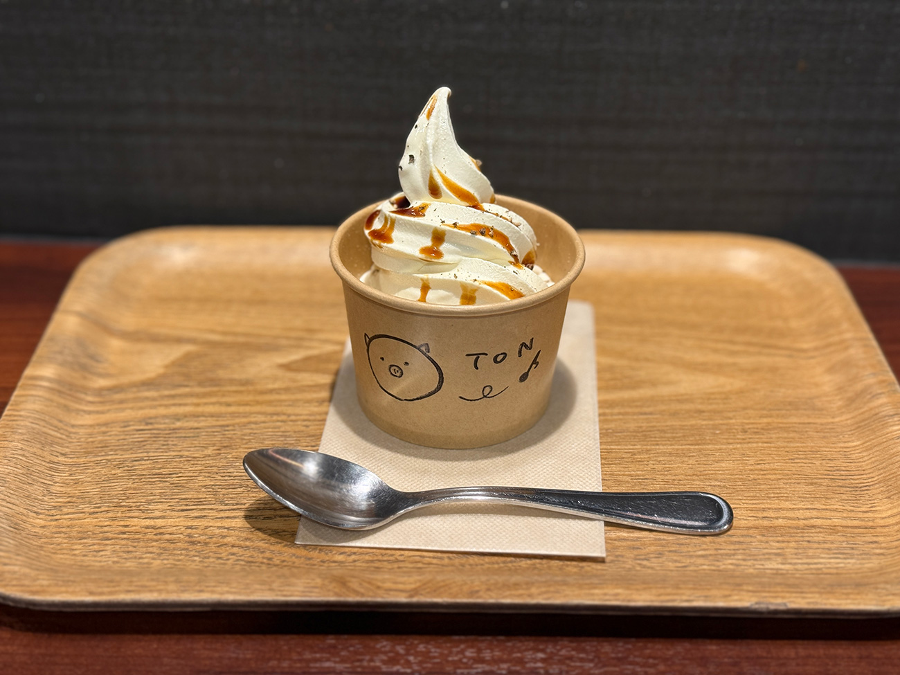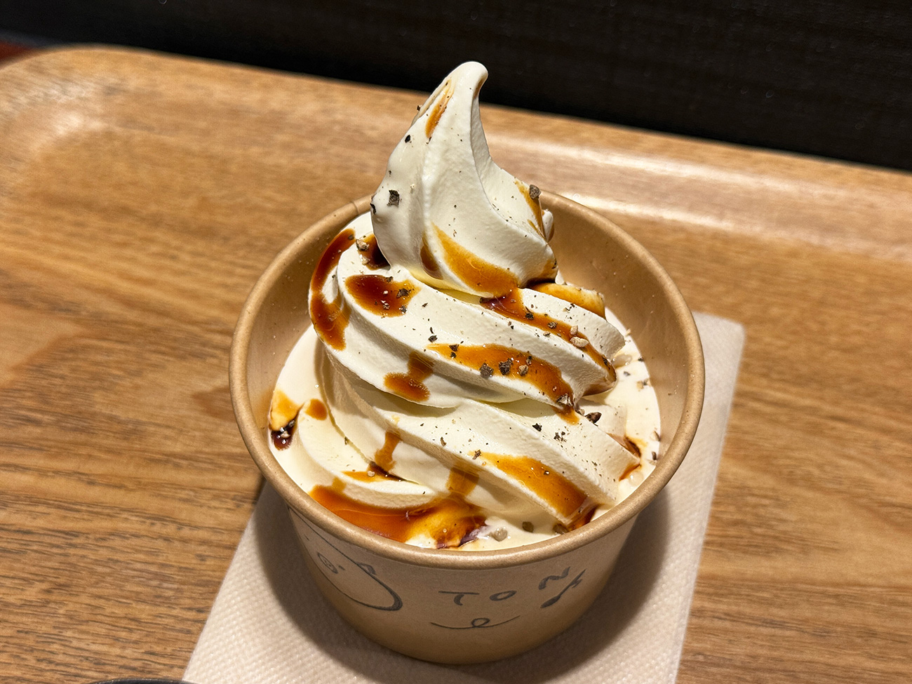 するとどうでしょう。濃厚なミルクソフトに豚丼のタレが調和し、なんとなくミルクの甘さが際立っている気がしますし、ブラックペッパーの刺激が実に絶妙なアクセント。甘さを半ば強引にピリッと引き締めてくれているのです。