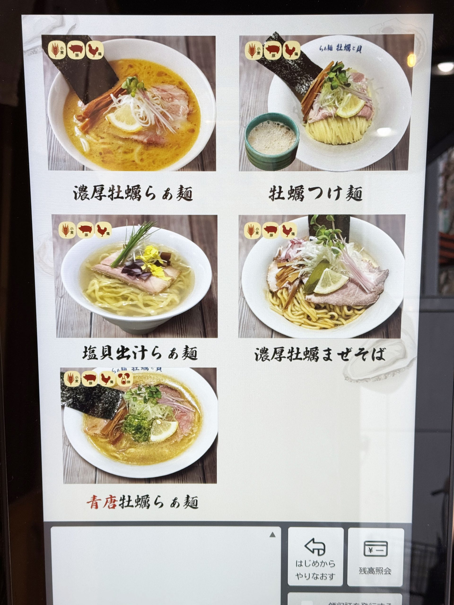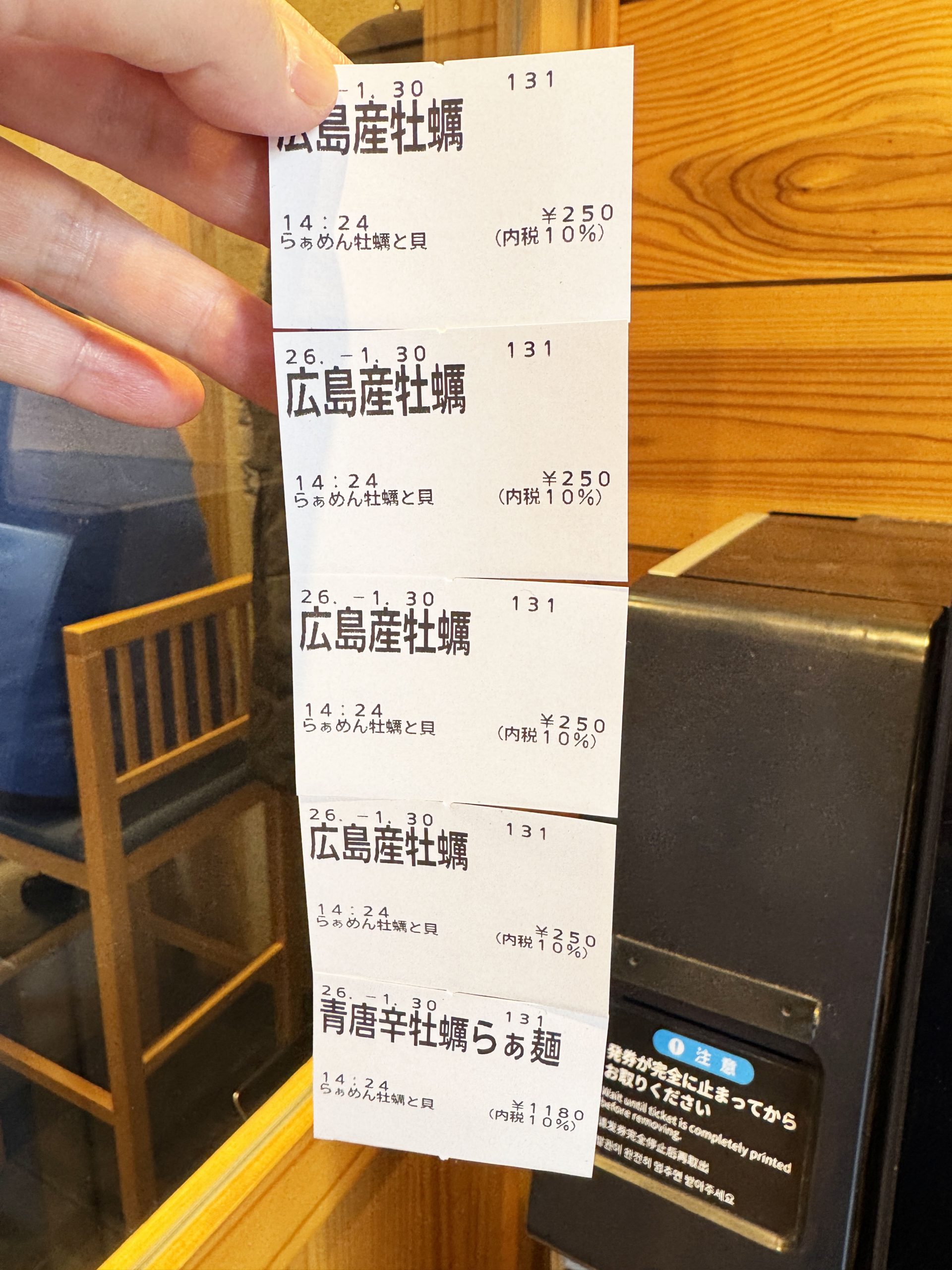 お店に行くと、店外に食券の券売機がありました。牡蠣のラーメン、貝のラーメン、そしてつけ麺など、複数の牡蠣と貝に特化した麺料理がラインナップとして揃えられていました。今回は、スパイシーな「青唐牡蠣らぁ麺」(1180円)を注文。さらに広島産の牡蠣(250円)を4つ追加しましたよ。