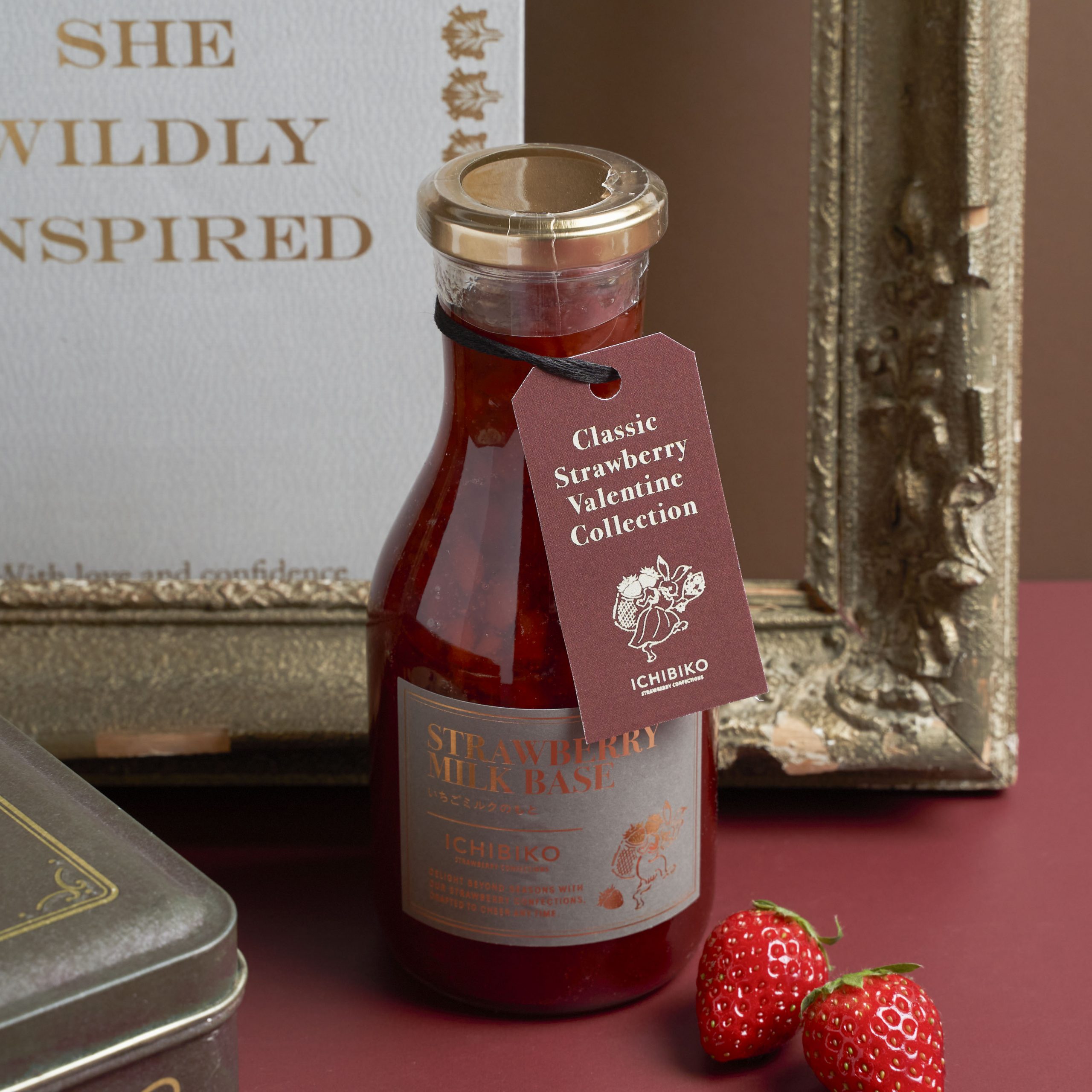 そしてICHIBIKOの人気商品「いちごミルクのもと」も、バレンタイン限定ラベルで登場します。たっぷり果肉の贅沢なおいしさはそのままに、ギフトにも映える季節限定デザインです。ミルクで割るだけで、ICHIBIKOカフェの味を手間いらずで自宅で楽しめますよ。