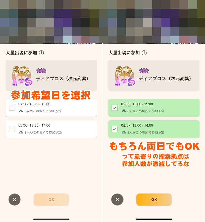 最寄りの探索拠点にアクセスして、参加希望日を選択。
