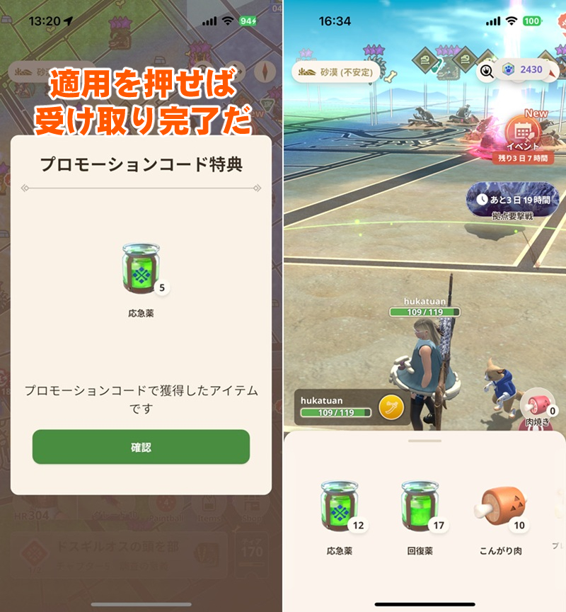 ・プロモーションコードを介した応急薬は所持数の上限を超えて受け取り可能。