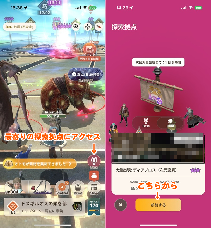次元臨界モンスターのように、最寄りの探索拠点に離れた場所からアクセスできれば少しだけ参加できるのだけど……。
