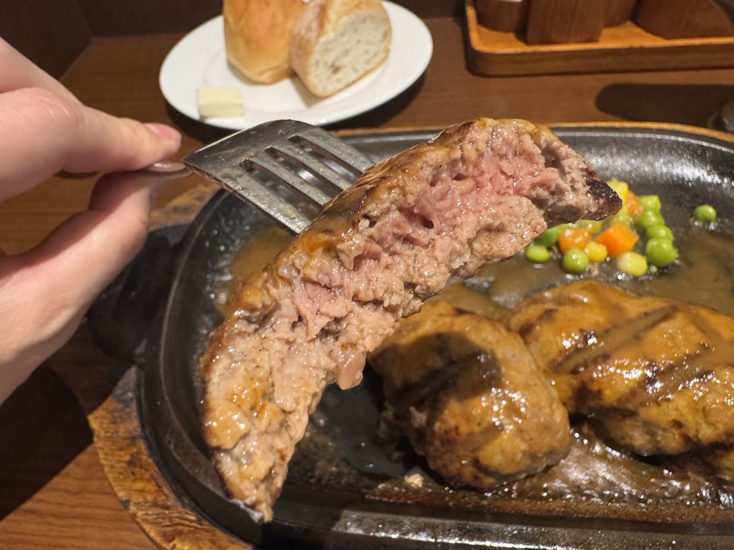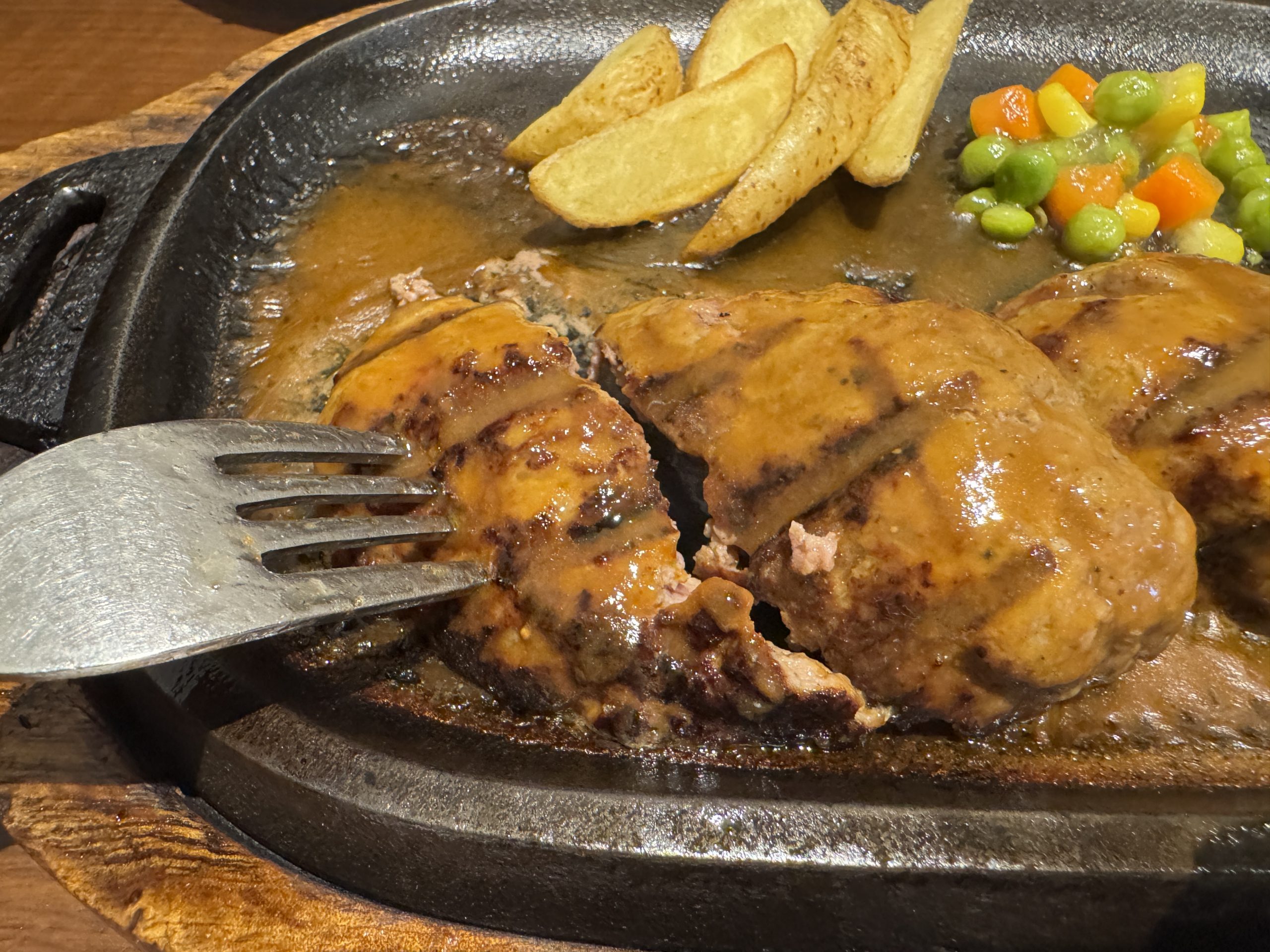ハンバーグは表面が焼かれた状態でテーブルにやってきます。