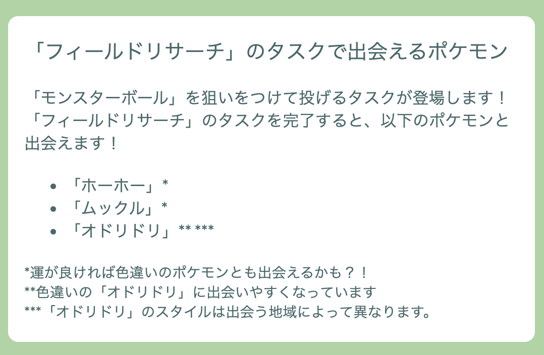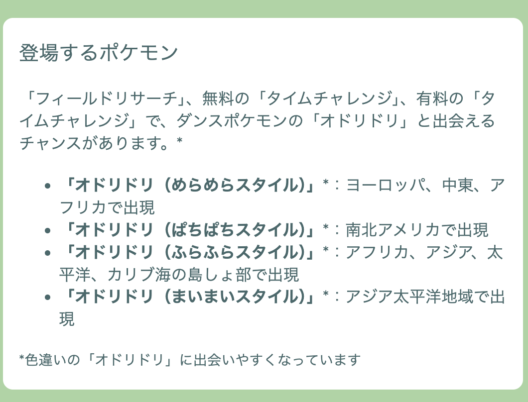 ところが、イベント中に配信されたタイムチャレンジやフィールドリサーチから、本来出現しないスタイルのオドリドリが出現したという報告がネット上で大量に確認されています。