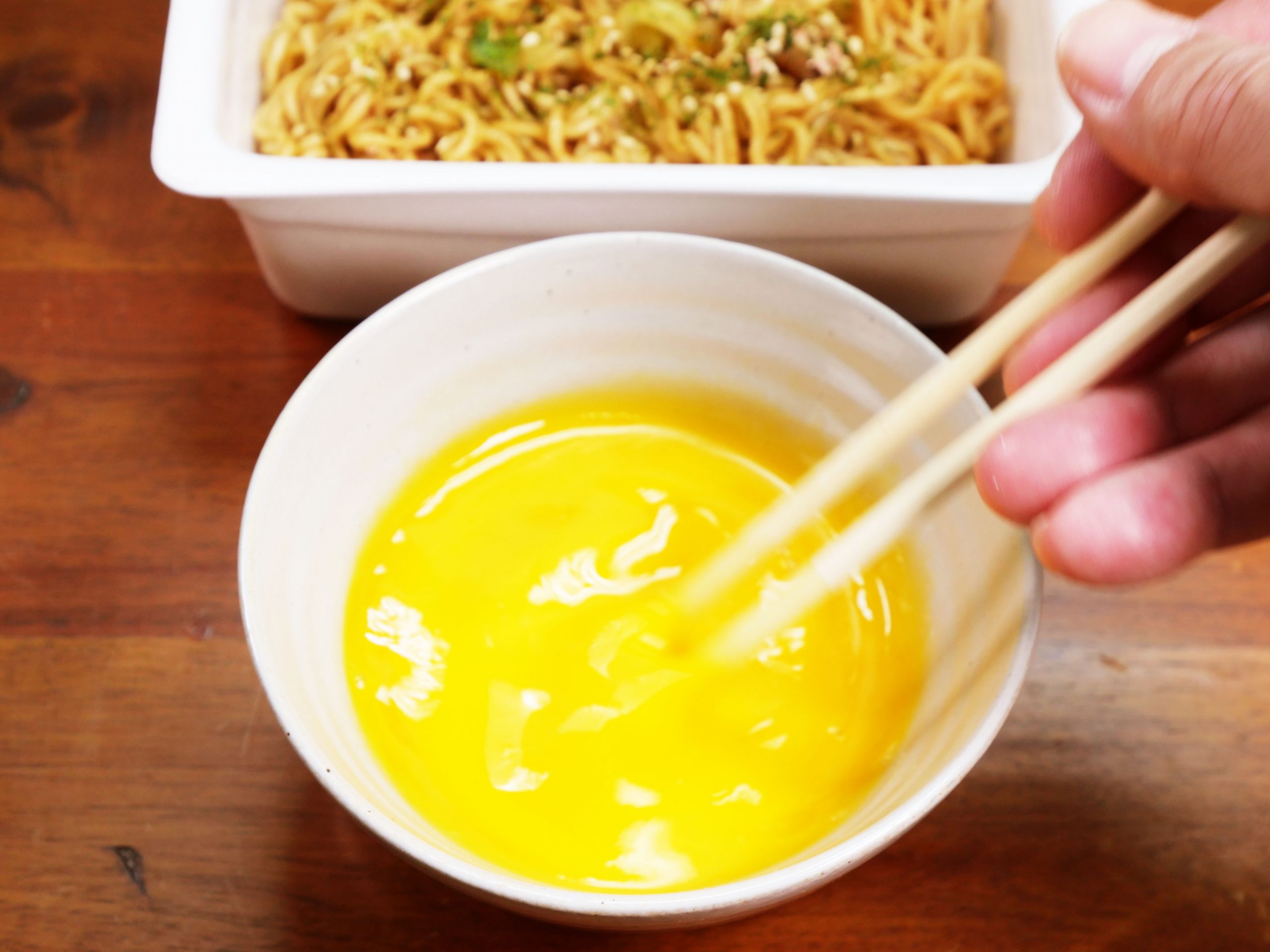 生卵をたっぷりと焼きそばに纏(まと)わせたかったので、今回は生卵2個を使用した。